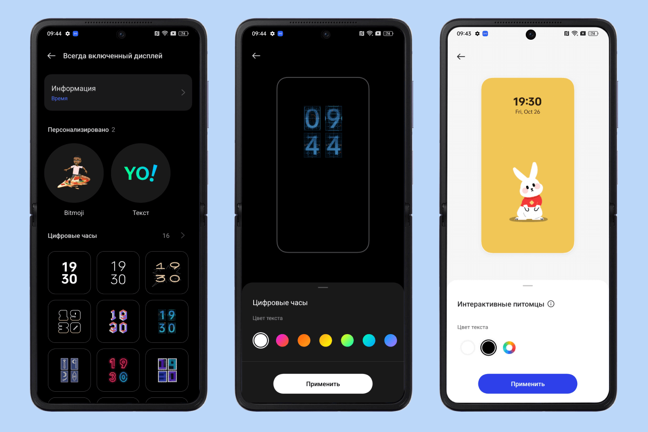 Также на экран выводятся различные виджеты, включая постоянно включенные часы. Дополнительно можно включить анимацию в виде какого-нибудь милого питомца.