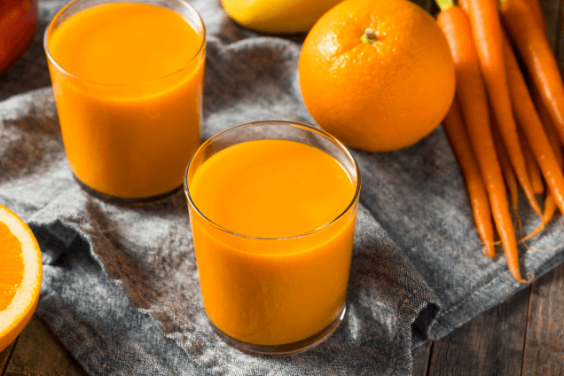 1. Морковь и апельсины очистить от шкурки, яблоко разрезать пополам и выжать сок из всех фруктов.