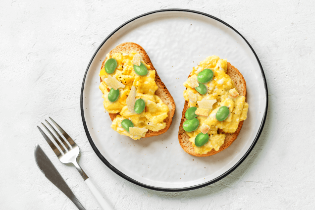 4. На каждый ломтик хлеба выложите яичницу-болтунью, а сверху — бобы, посыпьте солью и перцем по вкусу и украсьте лепестками пекорино, нарезав их помощью специального ножа для сыра или для чистки овощей (дарю лайфхак). Подавайте теплыми.