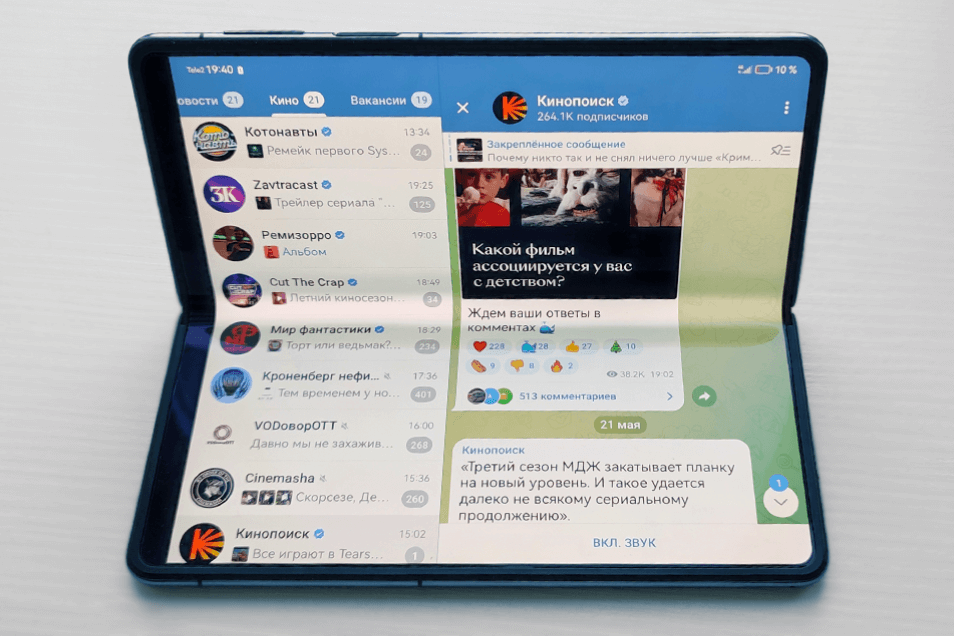 Складка на внутреннем экране видна, она же незначительно деформирует изображение, особенно если разложить смартфон не до конца или смотреть на него под большим углом. Но эта полоска совершенно не мешает в работе или при просмотре видео. Не баг, конечно, хотя и не сказать что фича.