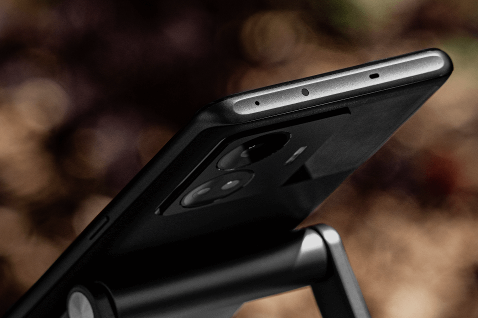 Одной из главных особенностей конструкции смартфона является минимально выпирающий блок камер, по соседству с которым размещена стеклянная панель. За ней ёразмещена антенна NFC-модуля, RGB-подсветка в форме буквы «С» и квадратик с надписью Snapdragon 8+ Gen1.