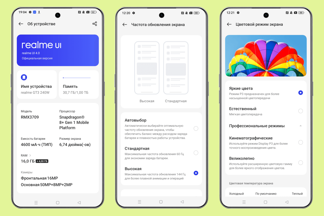 Работает realme GT3 под управлением операционной системы Android 13, поверх которой установлена графическая оболочка realme UI 4.0. Она поддерживает всё, что требуется для создания индивидуальности — статические и живые обои, настройку значков, множество настроек производительности и экрана, а также многое другое. Проблем начать использовать смартфон не будет ни у новичка realme как владельца иного Android-смартфона, ни у того, кто вообще впервые взял подобное устройство в руки.