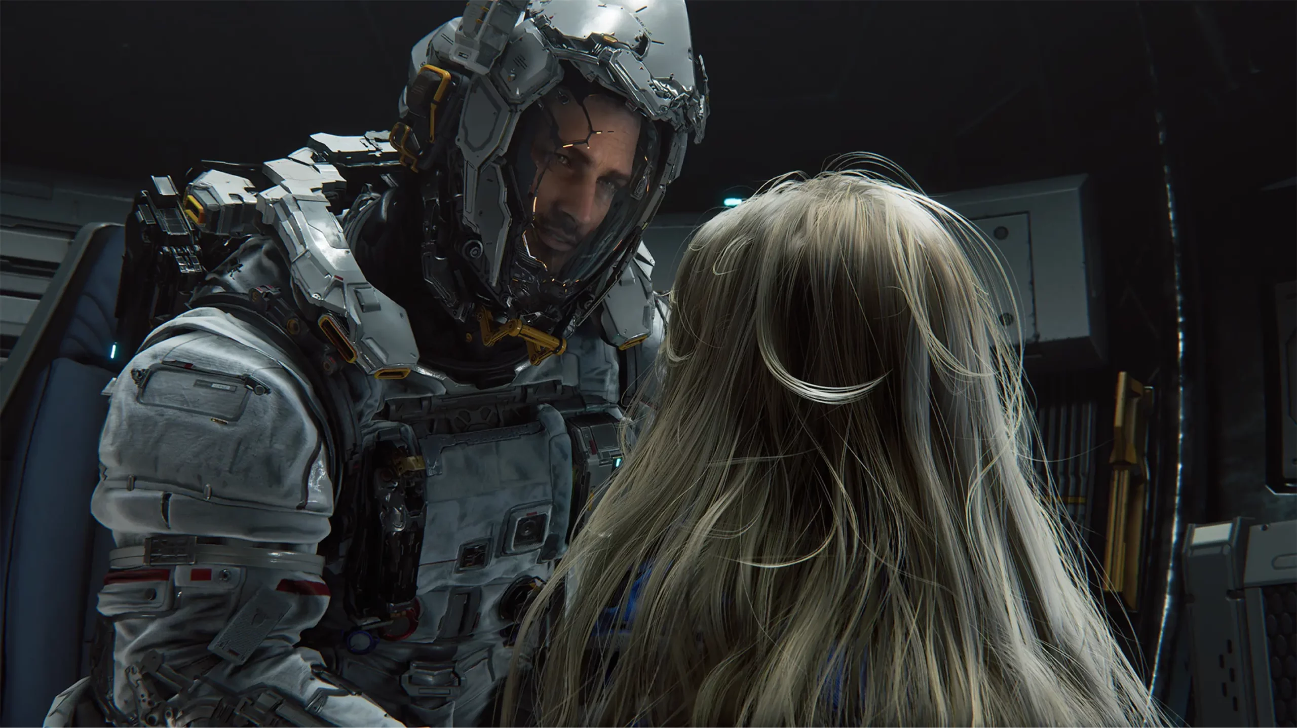 Главный герой в футуристичном скафандре — Хью Уильямс. Он выглядит как профессиональный солдат или ученый в продвинутой экипировке. В целом его внешний вид напоминает то, как EA представляла Айзека Кларка в самой первой части Dead Space. Он тоже не имел лица и не говорил ни слова. Это уже потом у Айзека появятся и внешность, и яркие реплики. Пока же Уильямс скорее загадка, но одно заметно по трейлеру — он относится к Диане скорее как к девочке, чем как к программе.