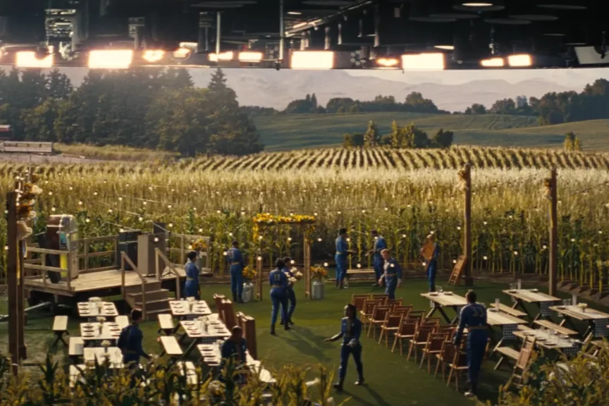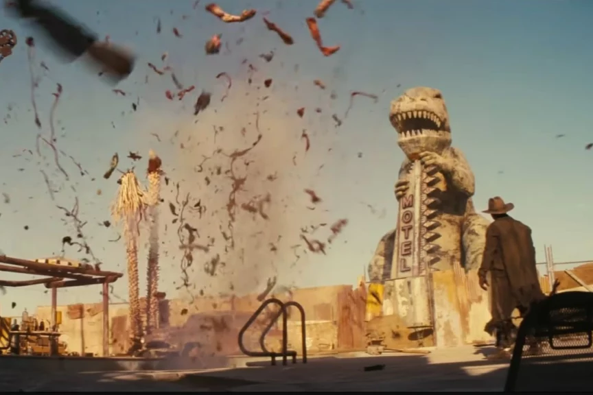 Создатели Fallout снова пошли по пути, в котором технологии существуют в симбиозе с человеческим креативом. Пустошь на экране — это и не компьютерная графика, и не натура. Это гибрид, в котором часть мира построена вручную, а часть создана на огромных экранах и дополнена эффектами.