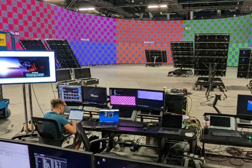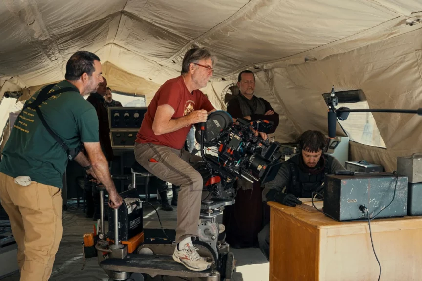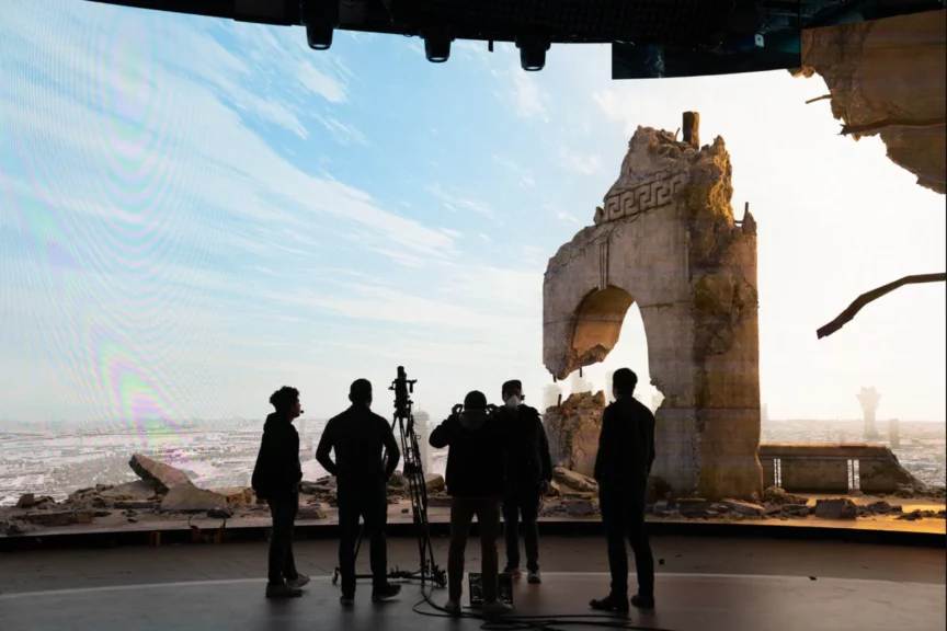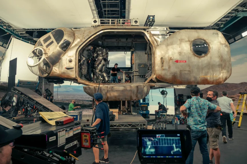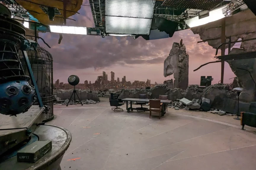 Во время съемок использовались LED-экраны, или, как их называют в индустрии, «волюмы». Это такие гигантские панели, на которых сразу показывают виртуальный фон — пейзажи, небо, руины. Актеры видят созданный мир прямо во время съемки, а не воображают его, как раньше, стоя перед зеленым экраном.