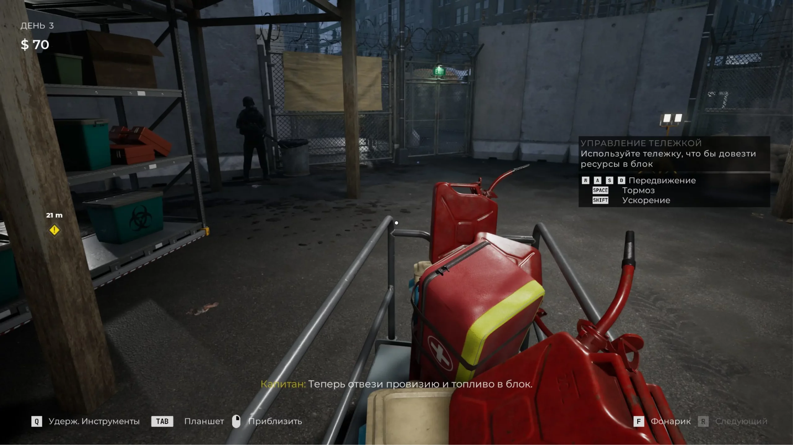 А вот таблицу привязки клавиш в настройки не завезли. Пока или в принципе — вопрос открытый. Но проблем с этим у меня не возникло. Набор стандартный: WASD, взаимодействие на E или с помощью мыши. Скорее всего, об отсутствии экрана привязки клавиш я бы и не узнала, если бы в моменте не словила ступор: а как тележку с припасами для базы из рук убрать? Возможно, подсказка об этом была на экране, но я ее пропустила.