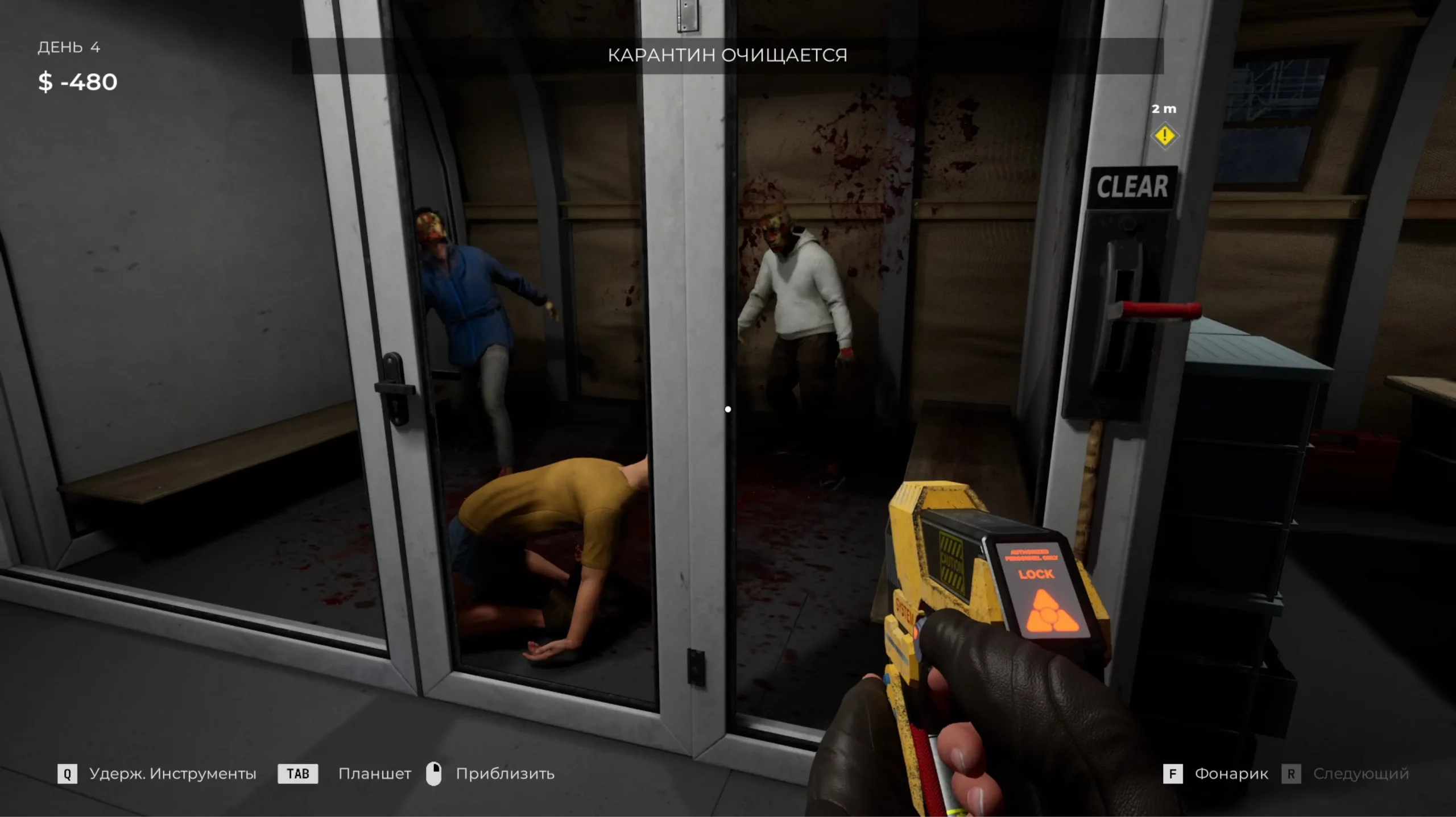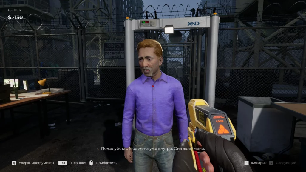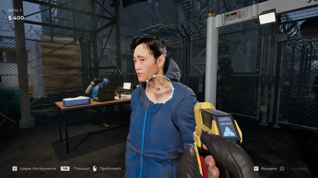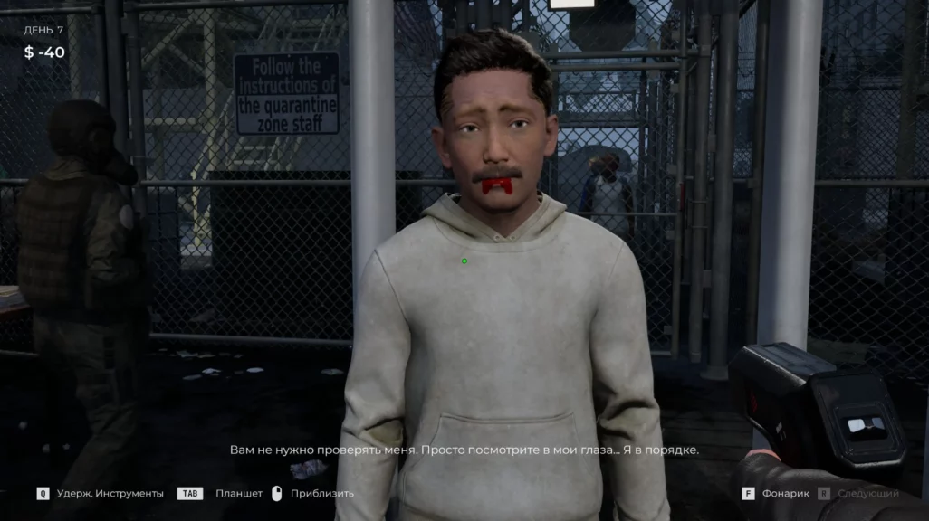 Сама игра затягивает. Внимательность нужно выкручивать на максимум, чтобы не пропустить ни одного подозрительного пятна на теле очередного беженца. По атмосфере проект цепляет. Визуально он минималистичный, но каждый звук, каждая тень создают напряжение. Страшного ничего не происходит. В первый день предстоит осматривать беженцев просто глазами. На следующий — выдают ручной сканер и УФ-фонарик. После — термометр. И так далее, по нарастающей. А вот когда выдают пистолет и предупреждают, что зараженные бывают агрессивными и могут нападать, становится некомфортно. Весь игровой процесс сосредоточен в середине экрана. Лица беженцев то и дело маячат перед глазами. До первого нападения не понимаешь, будет в тот момент, когда зараженный станет агрессивным, резкий скример или нет. Даже после первого агрессивного беженца тревога не отпускает. Вдруг в тот раз обошлось без скримера, но дальше кто-то точно выпрыгнет на весь экран?