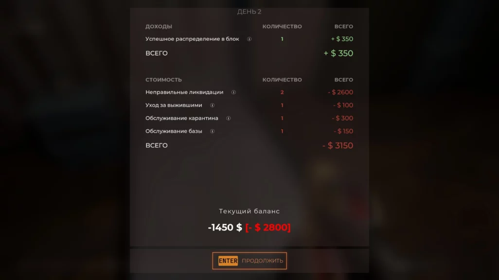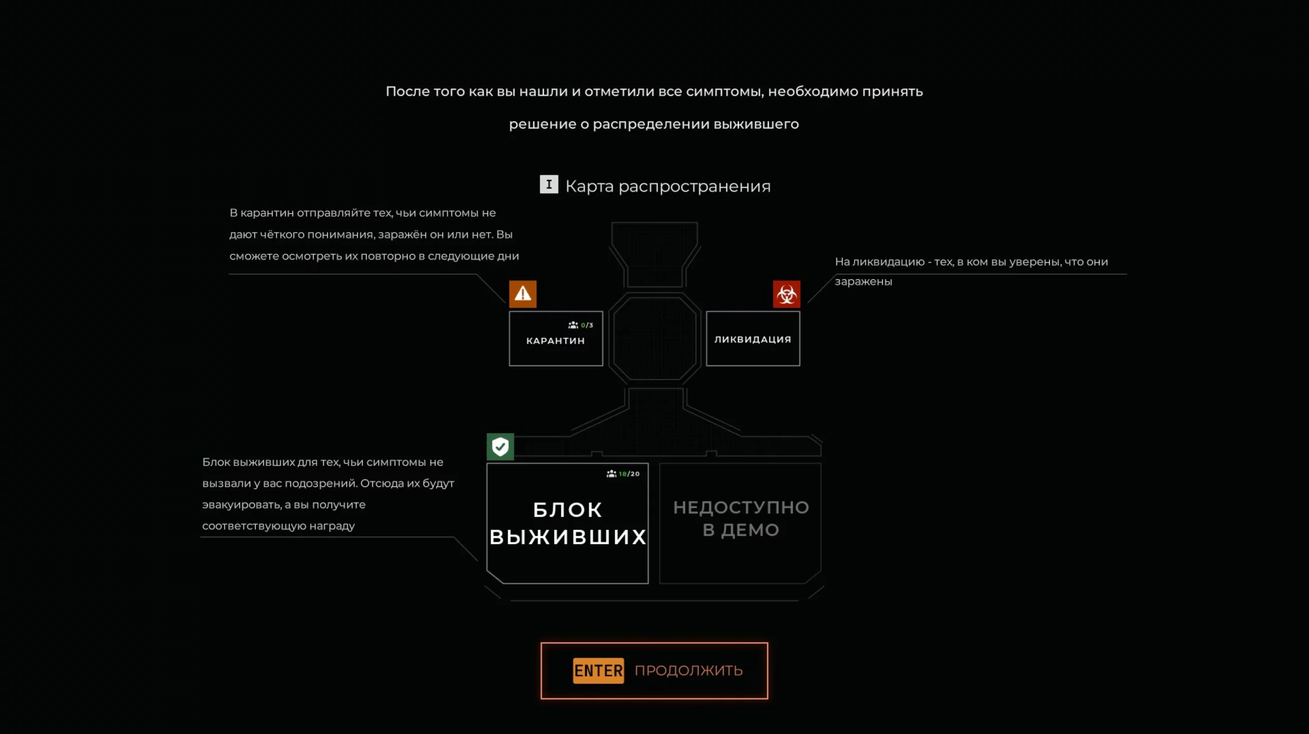 Цена ошибки высока. Пропустите зараженного к здоровым — они все умрут. Ликвидируете здорового — будете оштрафованы. А если поместить в карантин нескольких подозреваемых, то игра превращается в рулетку. Наутро вы можете обнаружить всех беженцев зараженными, потому что среди них оказался настоящий зомби. В таком случае придется ликвидировать всех.