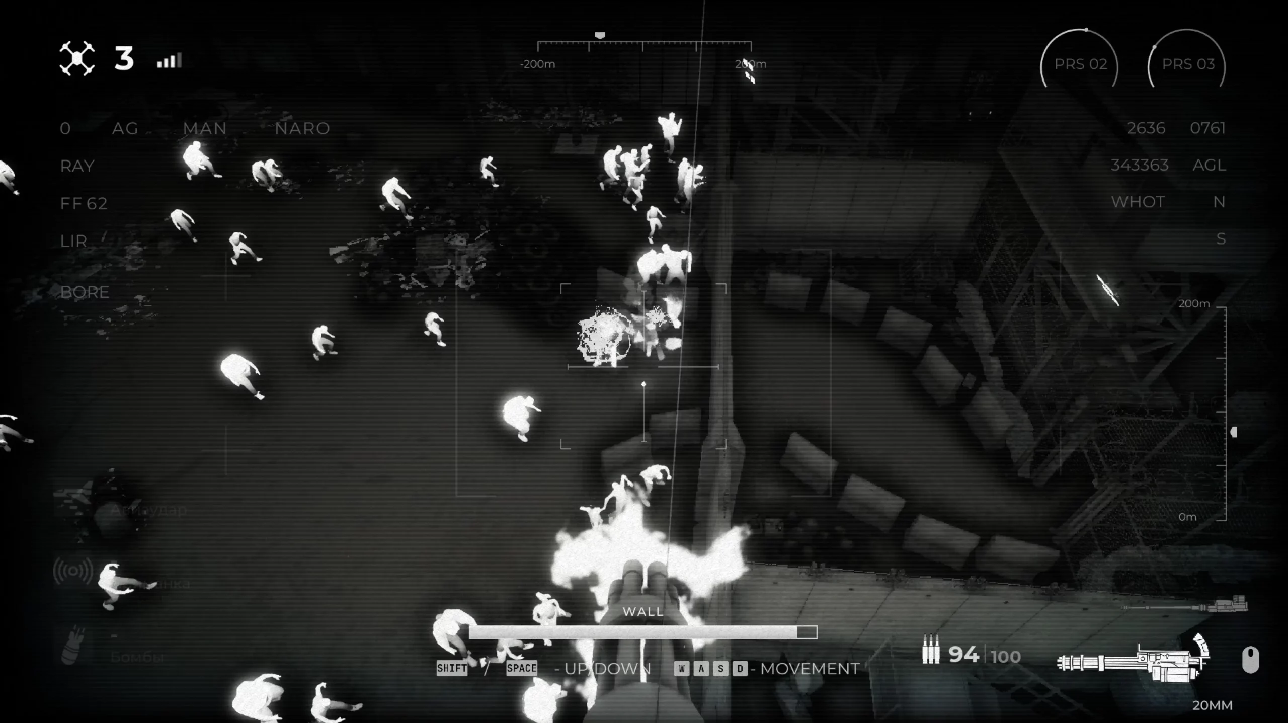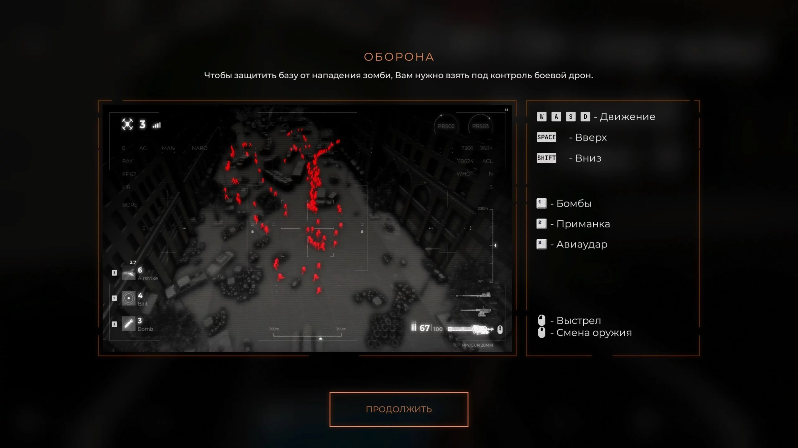 По ночам случаются мощные зомби-атаки, от нападающих необходимо отстреливаться с помощью дрона.