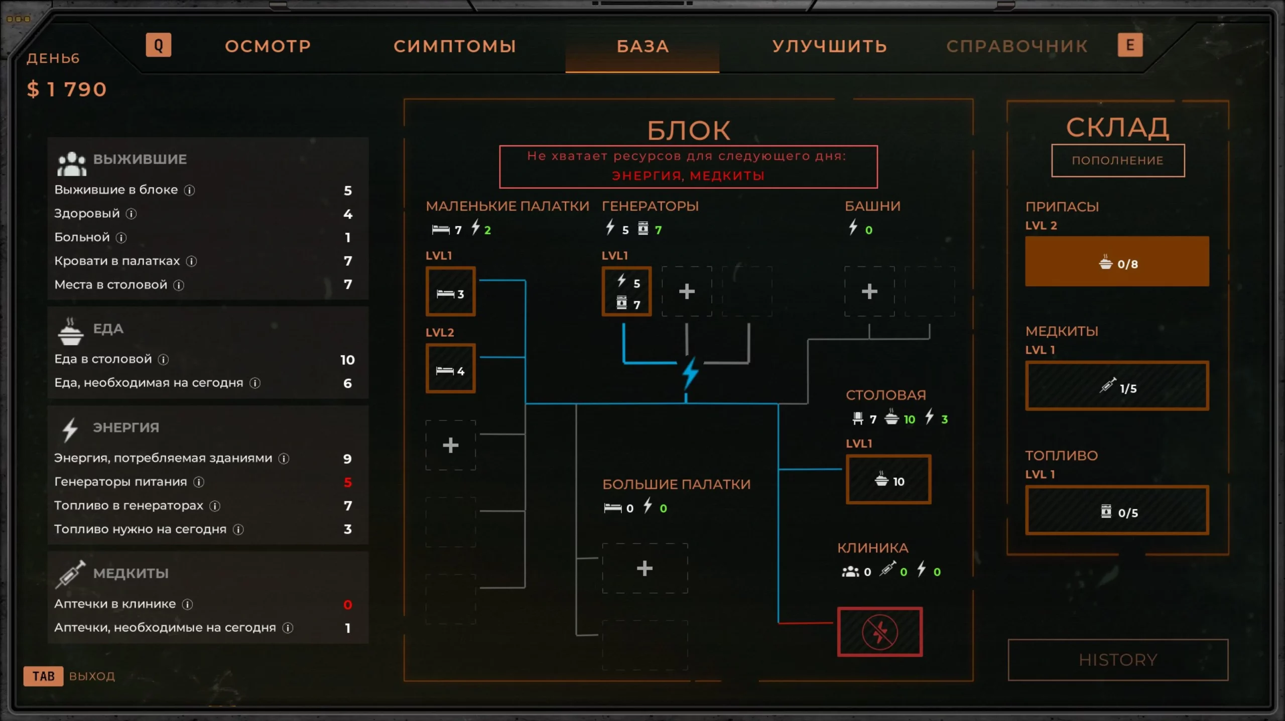 Параллельно необходимо заниматься развитием базы: закупать продукты, медикаменты, топливо, оборудовать новые спальные места, правильно распределять энергию генераторов, улучшать внешнюю защиту.