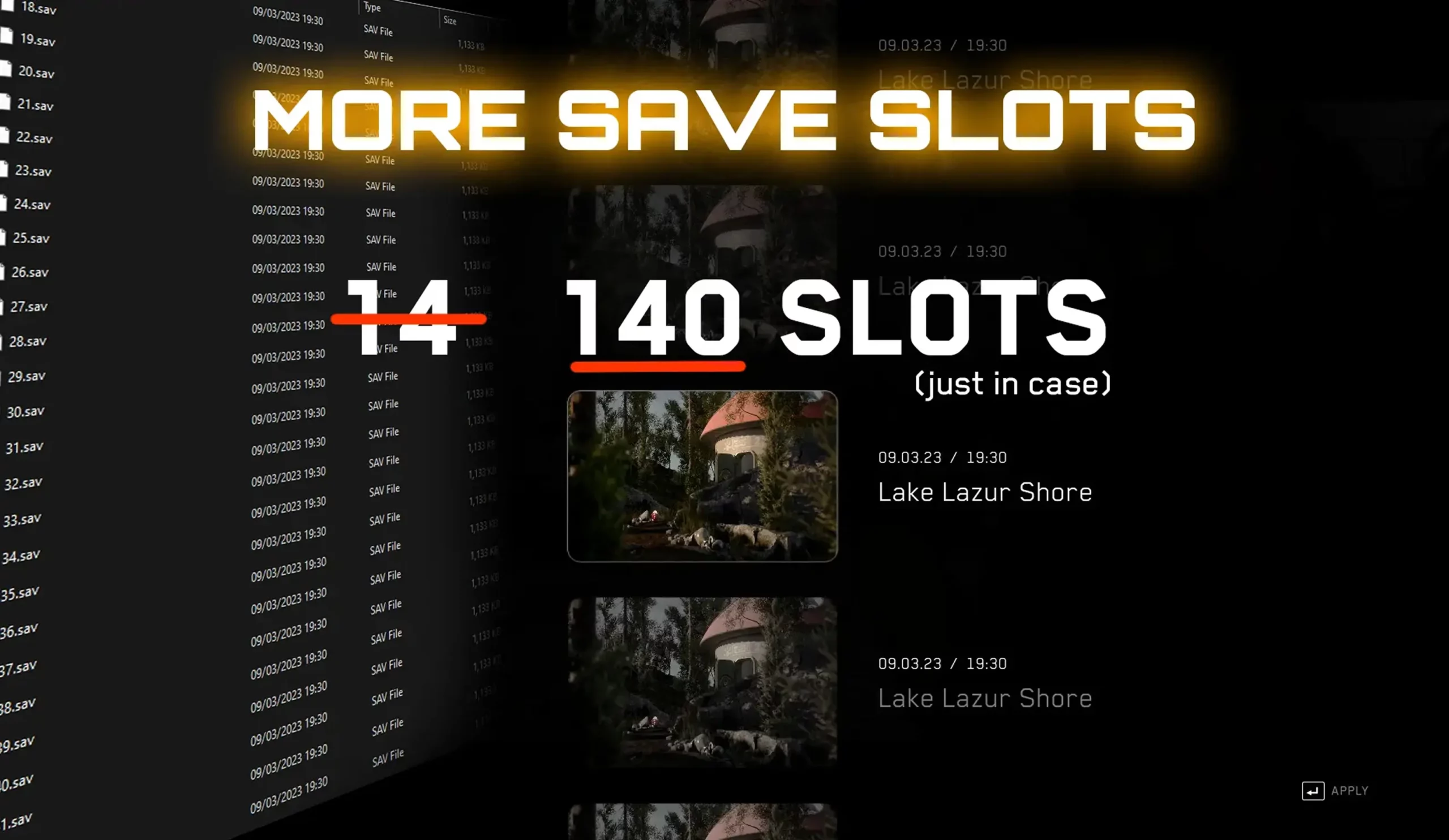 Мод добавляет больше доступных для использования слотов сохранения: их количество увеличивается в 10 раз — до 140. Если вдруг вы захотите удалить модификацию, не забудьте продублировать файлы сохранения в отдельную папку. После удаления мода игра распознает только те сейвы, что имеют имена от 0 до 9. Поэтому просто переименуйте последние сохранения после того, как отправите мод в корзину.