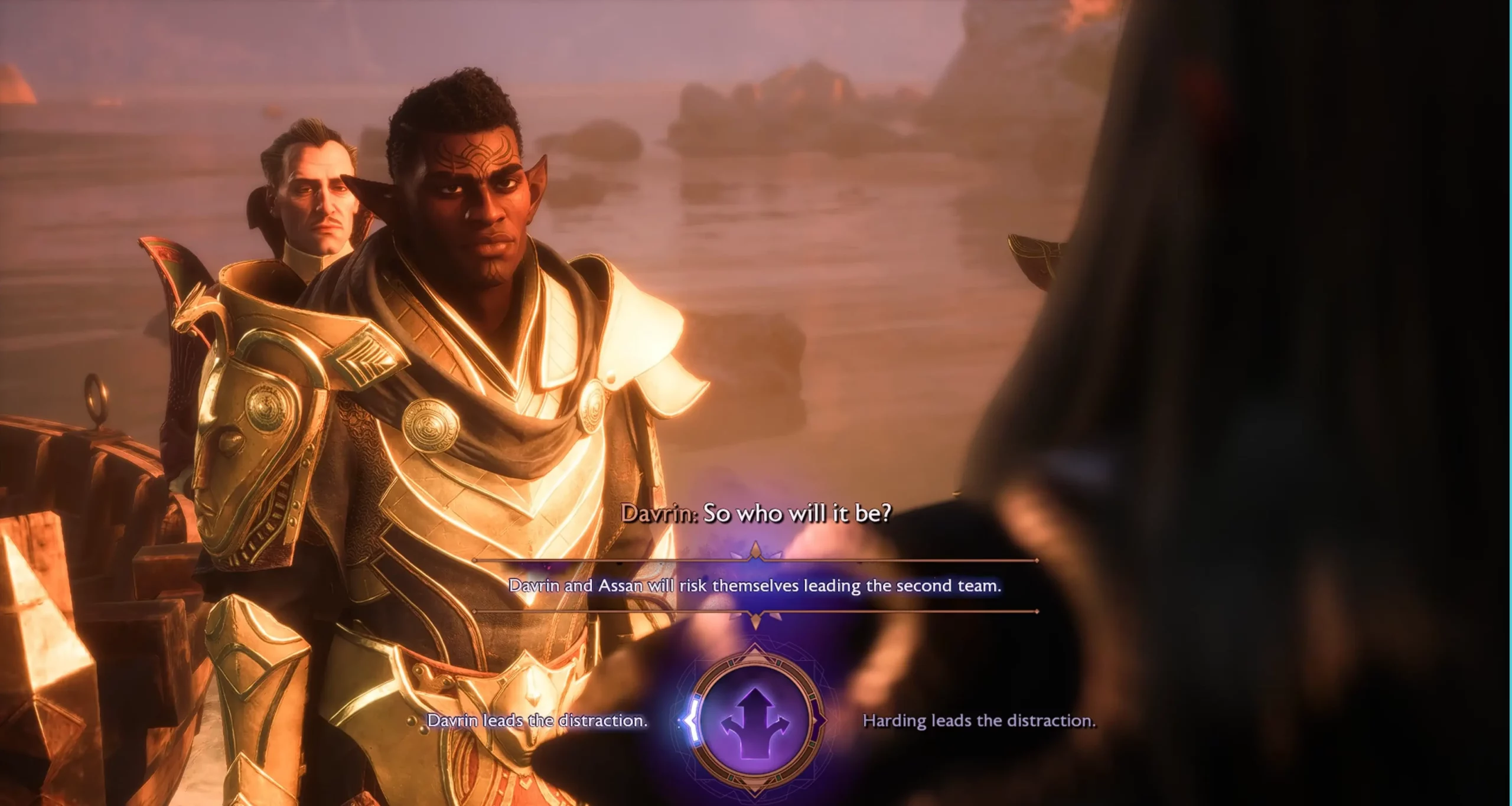 Стоит быть осторожным, если у вас роман с Хардинг или Даврином. В начале финальной битвы игроку предложат выбрать, кого из них поставить лидером отвлекающей команды. И независимо от степени развития отношений выбранный спутник безальтернативно пожертвует собой ради убийства одного из эльфийских богов.