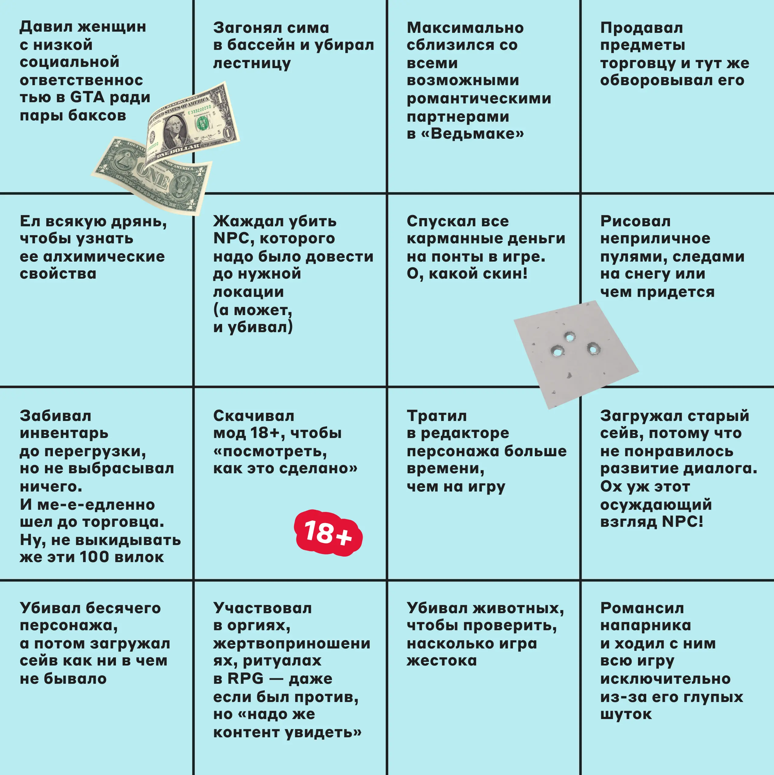 В бинго я набрала 12 очков. Не загоняла симов в бассейн и не распутничала в «Ведьмаке» — просто потому, что не играла в The Sims и так и не допрошла «Ведьмака 3». А еще не скупала игровые предметы за реальные деньги и не убивала животных, чтобы «просто посмотреть». Остальное — ну, было и было! Ни о чем не жалею.