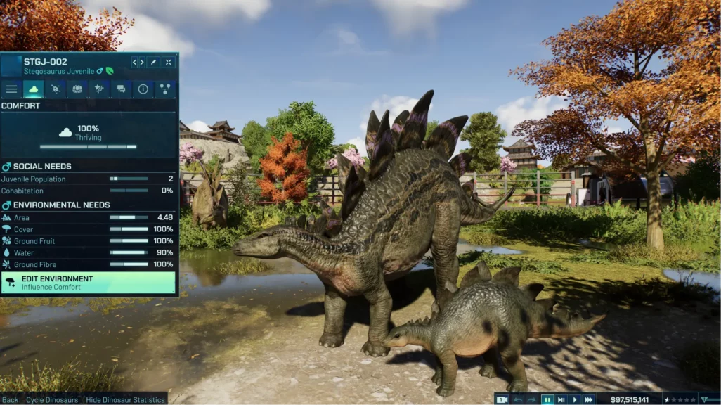 Малыши живут в семейных группах: одни держатся ближе к родителям, другие — к стаду, третьи исследуют вольер на свой страх и риск. Одни взрослые заботятся о детенышах, другие игнорируют их — и тогда вам, как управляющему, придется компенсировать недостаток заботы. Детеныши предъявляют свои требования к среде и пище, а их благополучие напрямую влияет на родителей. Если все продумать, юные особи вырастают здоровыми, получают бонусы за «счастливое детство» — и однажды сами продолжат жизненный цикл.