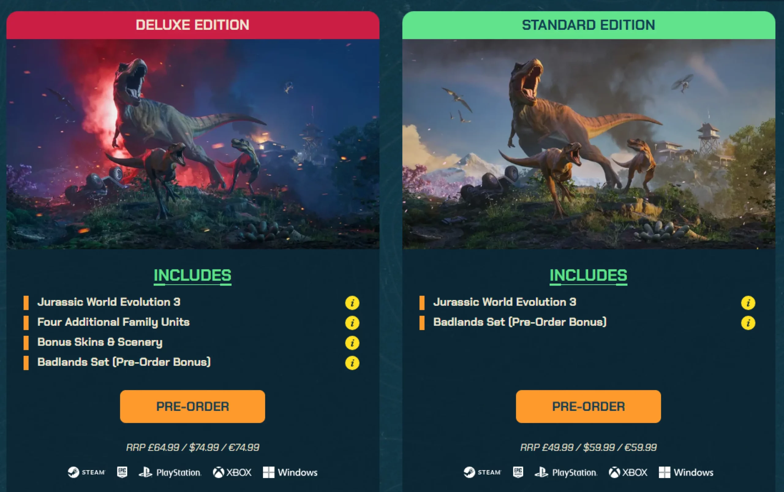 Jurassic World Evolution 3 будет доступна в двух основных версиях — Standard и Deluxe, плюс бонусы за предзаказ.