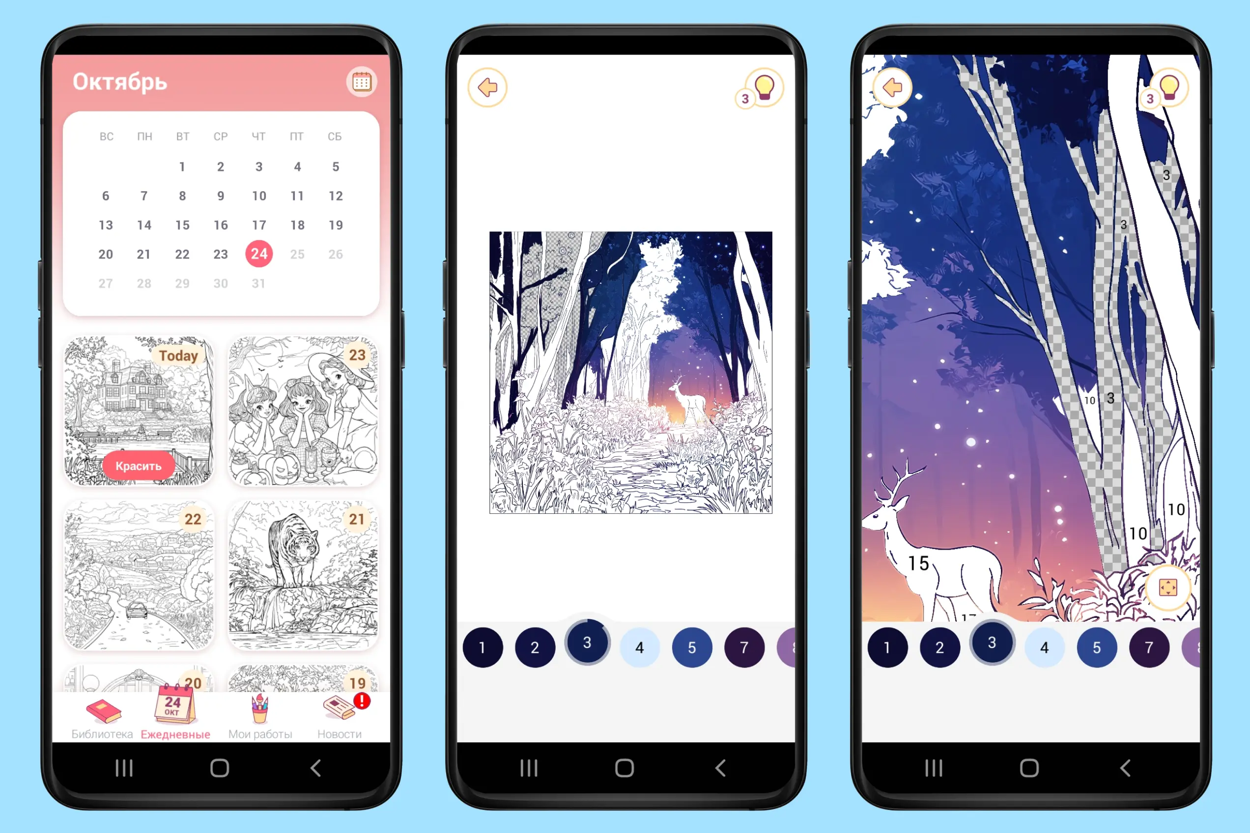 Happy Color — это мобильное приложение, которое позволяет раскрашивать иллюстрации по номерам. Игра предназначена для тех, кто ищет расслабляющий способ провести время. Игроки могут выбирать из множества картинок разных категорий, начиная от животных и пейзажей до популярных персонажей и узоров. Игровой процесс максимально прост и интуитивно понятен: картинка делится на небольшие пронумерованные сегменты. Нужно просто выбрать цвет и касаться соответствующих областей на изображении, чтобы их раскрасить. Приложение доступно бесплатно для устройств на iOS и Android.