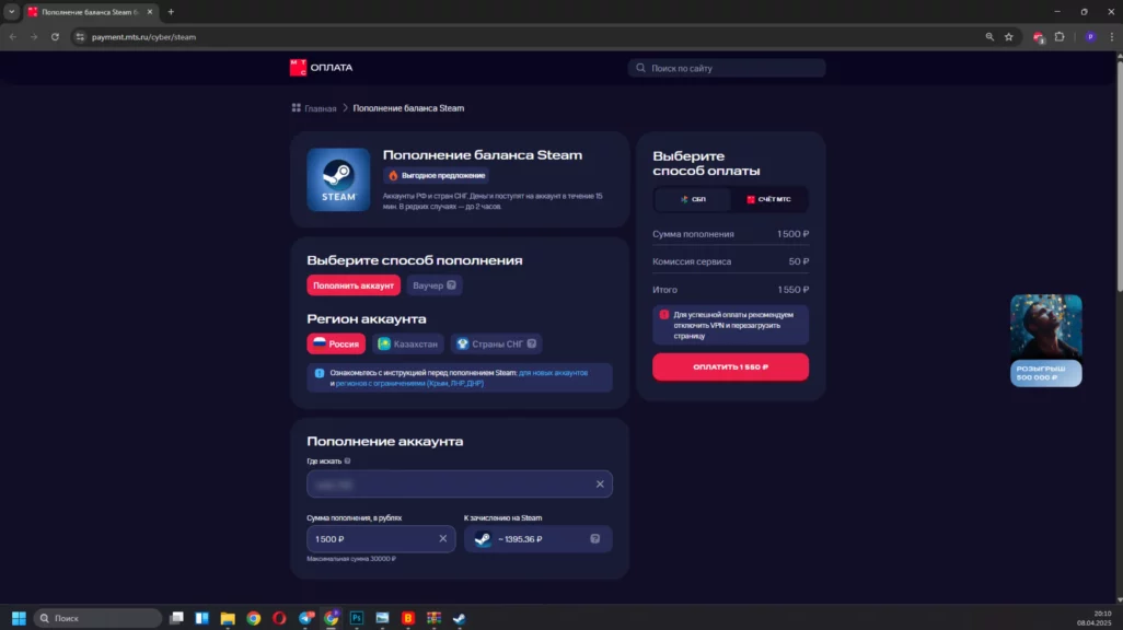 - Для пополнения с помощью МТС перейдите по этой ссылке. В открывшемся окне нужно будет выбрать регион аккаунта (Россия, Казахстан или прочие страны СНГ), ввести свой логин и необходимую сумму пополнения. Кстати, на счет придет меньше денег, чем будет оплачено: на стороне Steam производится конвертация валют, которая «съедает» часть средств — примерно 10−15%. Также оператор возьмет 50 рублей в виде комиссии. С этим придется смириться: подобная разница есть в каждом способе пополнения кошелька.