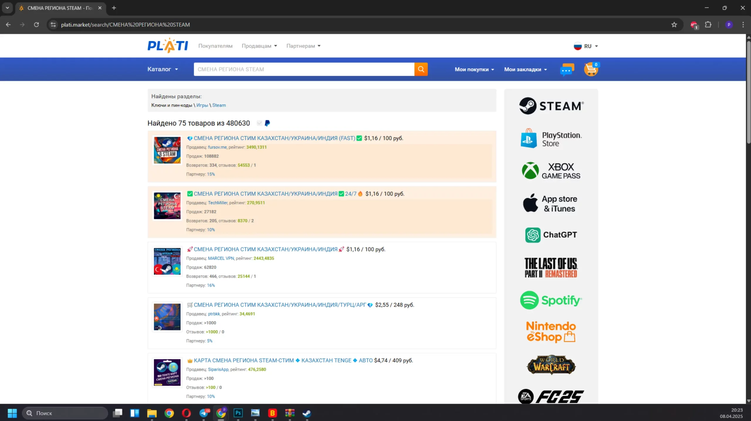 - найти исполнителей можно на сайте plati.market, для этого введите в поиск: «Смена региона Steam», — и выберите Казахстан (или другой приглянувшийся регион);