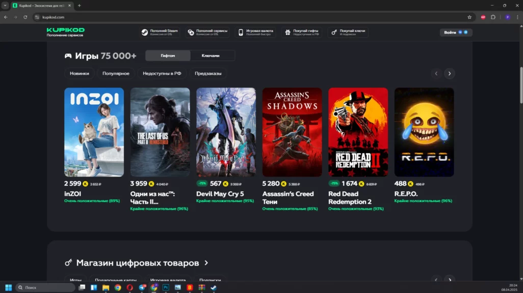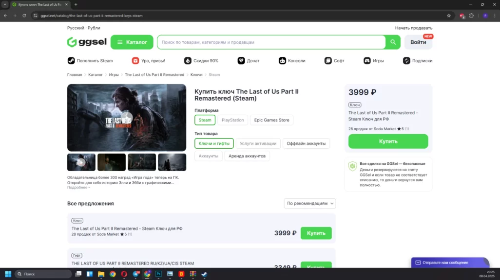 Если по какой-то причине вам не хочется менять регион, есть и другой способ покупки игр в «Стиме» в 2025 году — через услуги сторонних «серых» продавцов ключей активации и гифтов. Такой обходной путь обойдется дороже, чем покупка в том же Казахстане, в среднем на 300−500 рублей. Конечная цена будет зависеть от продавца. Кроме того, вы потеряете возможность приобретать заблокированные в РФ игры в рамках многочисленных скидочных предложений Steam.