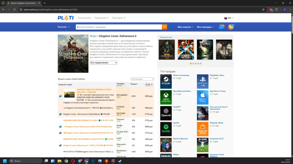 В сети можно найти много площадок, продающих недоступные в России игры. Самым беспроигрышным вариантом будет использование все того же plati.market — это один из крупнейших маркетплейсов в России, на который стекаются в том числе представители площадок калибром поменьше. Поэтому на платформе зачастую можно найти самые выгодные предложения, ведь множество продавцов сражаются за покупателей.