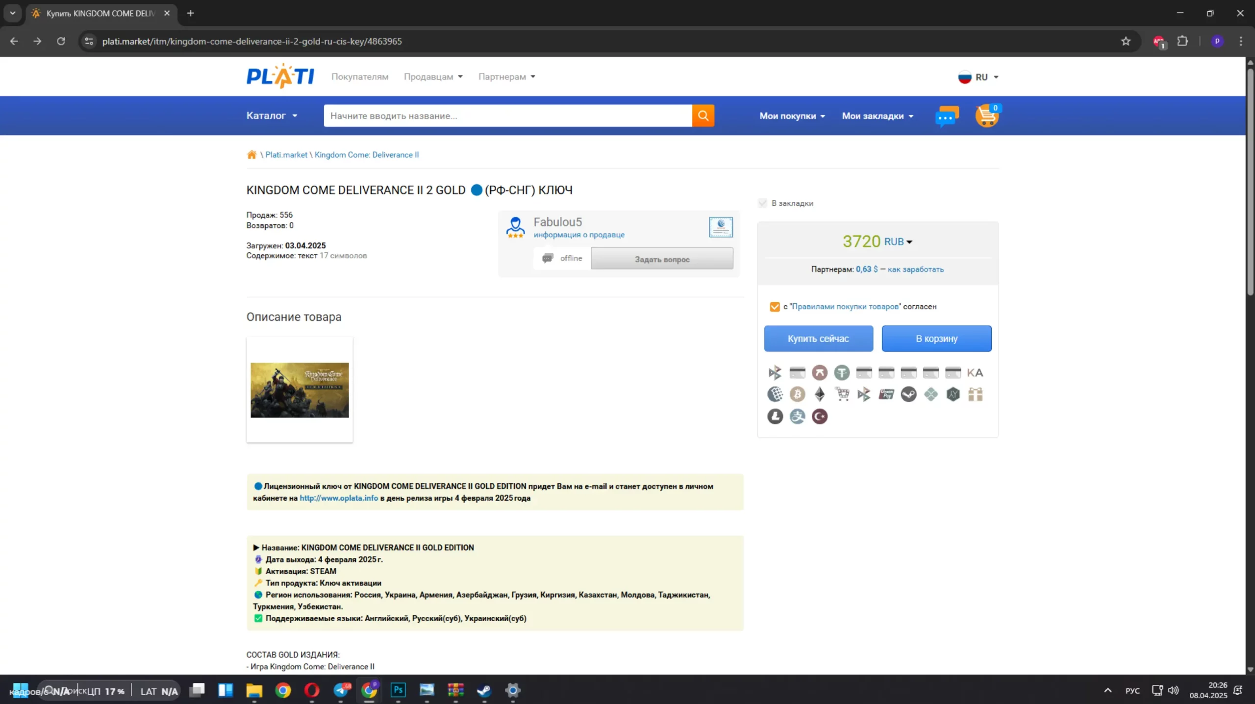 - после оплаты придется поделиться с продавцом данными своего аккаунта Steam — логином и паролем (не переживайте, с аккаунтом ничего не случится, если вы выбрали посредника с высокой оценкой);