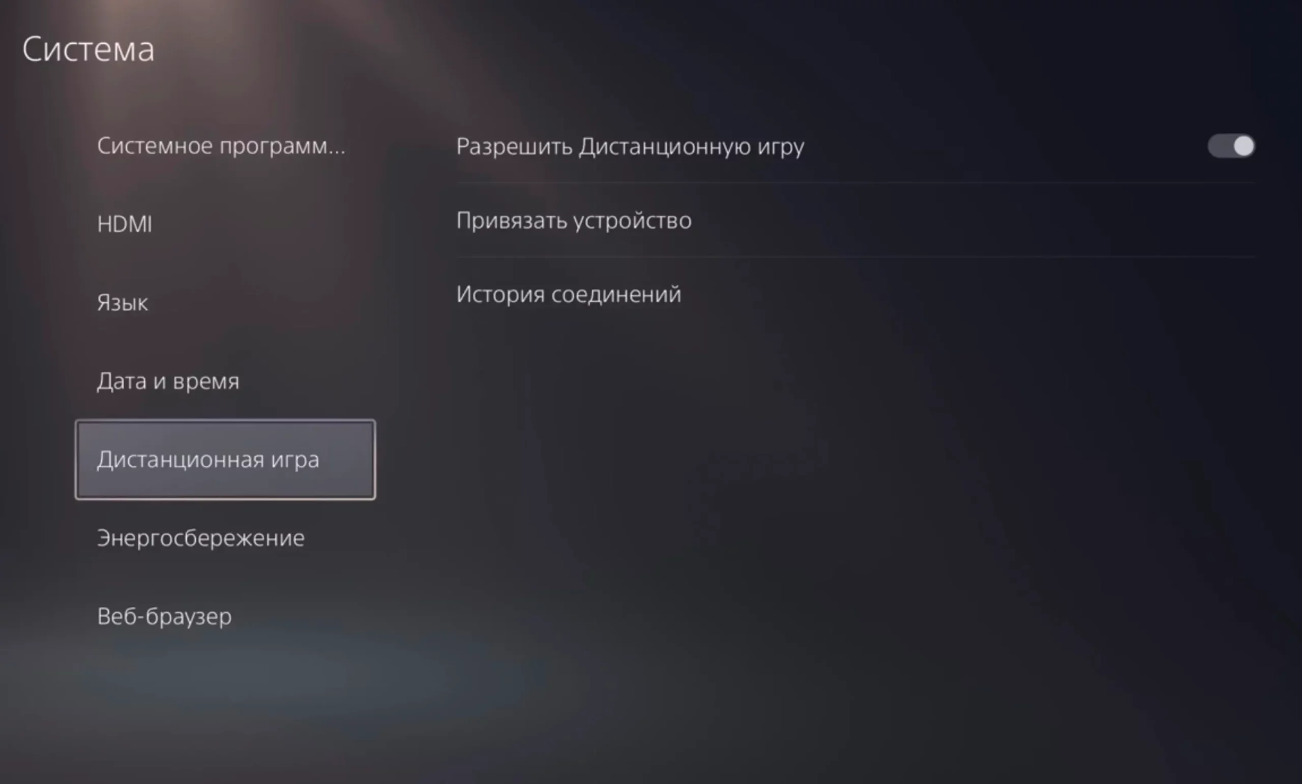 - На PS5 зайдите в настройки и нажмите «Система». Далее кликните «Привязать устройство» во вкладке «Дистанционная игра».