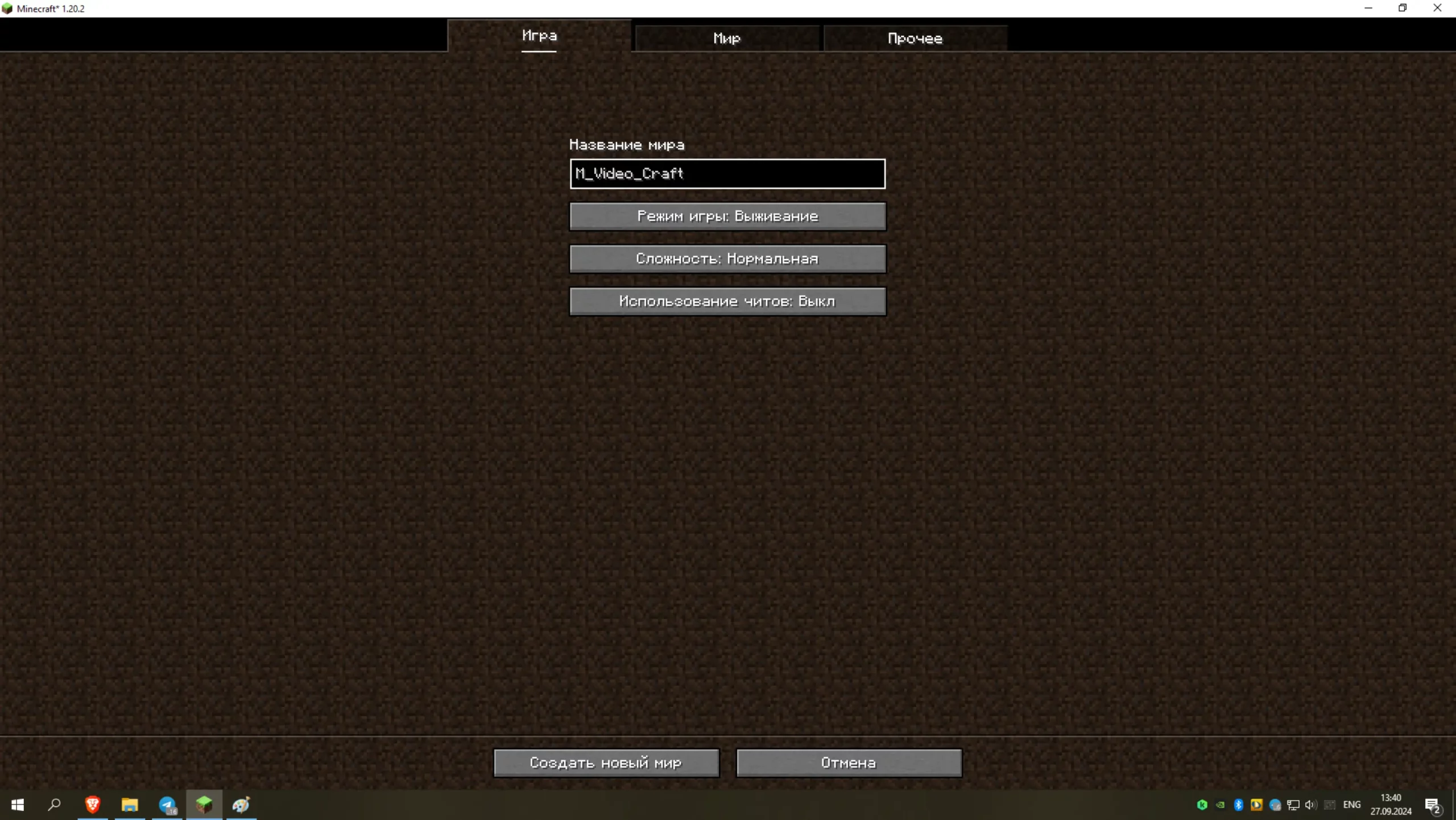 - Задайте параметры нового мира: название, режим, сложность, возможность включать читы и все остальное. Нажмите кнопку «Создать новый мир».