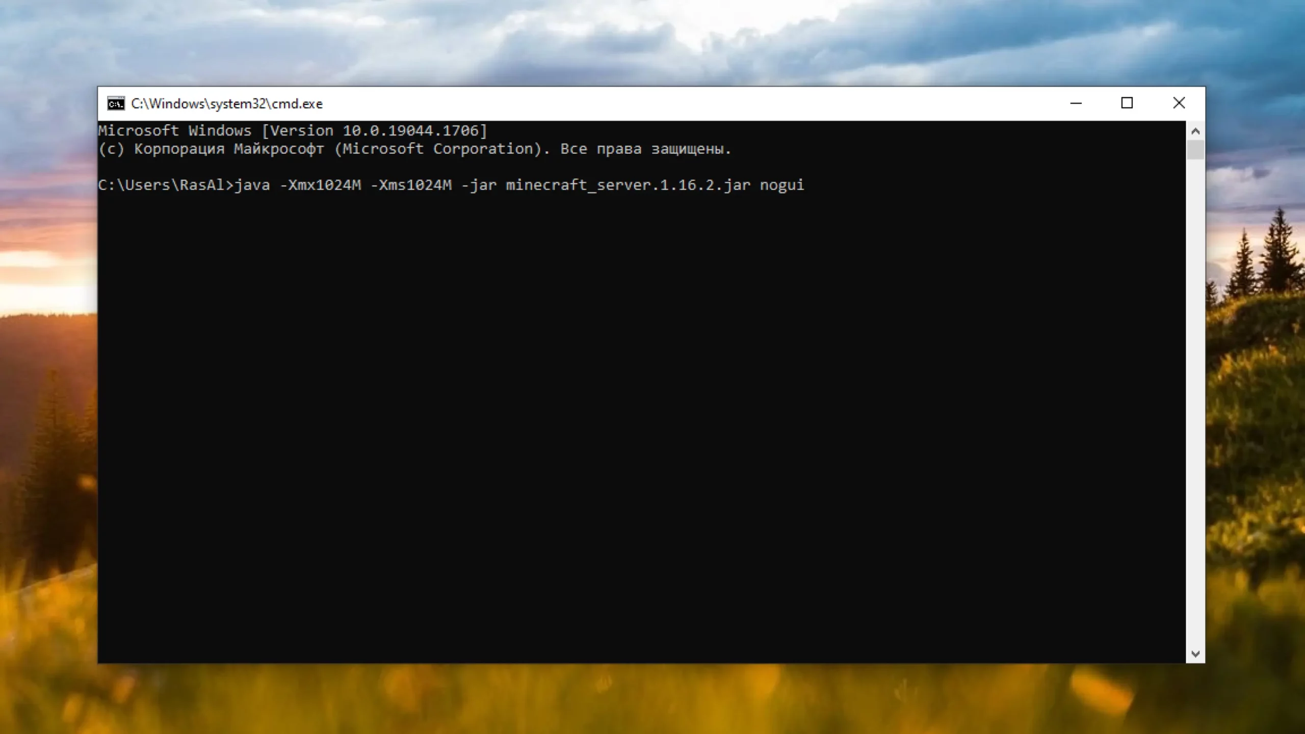 7. Введите в нем команду java -Xmx1024M -Xms1024M -jar minecraft_server.1.16.2.jar nogui и нажмите Enter.