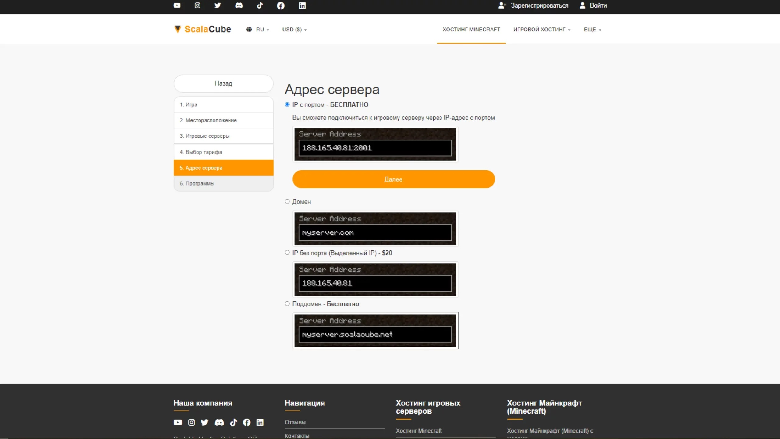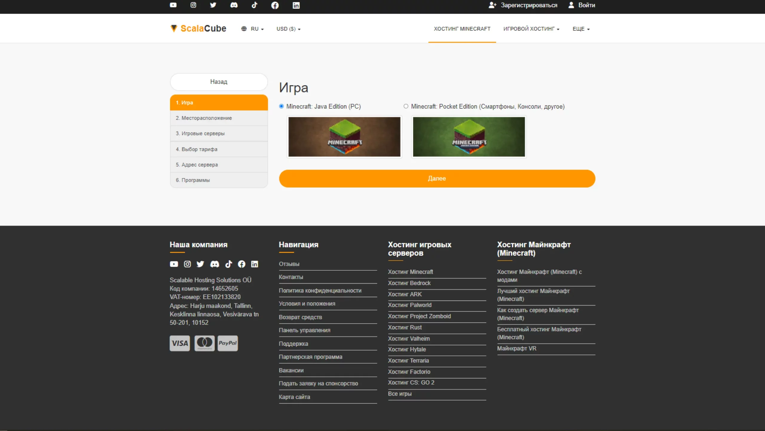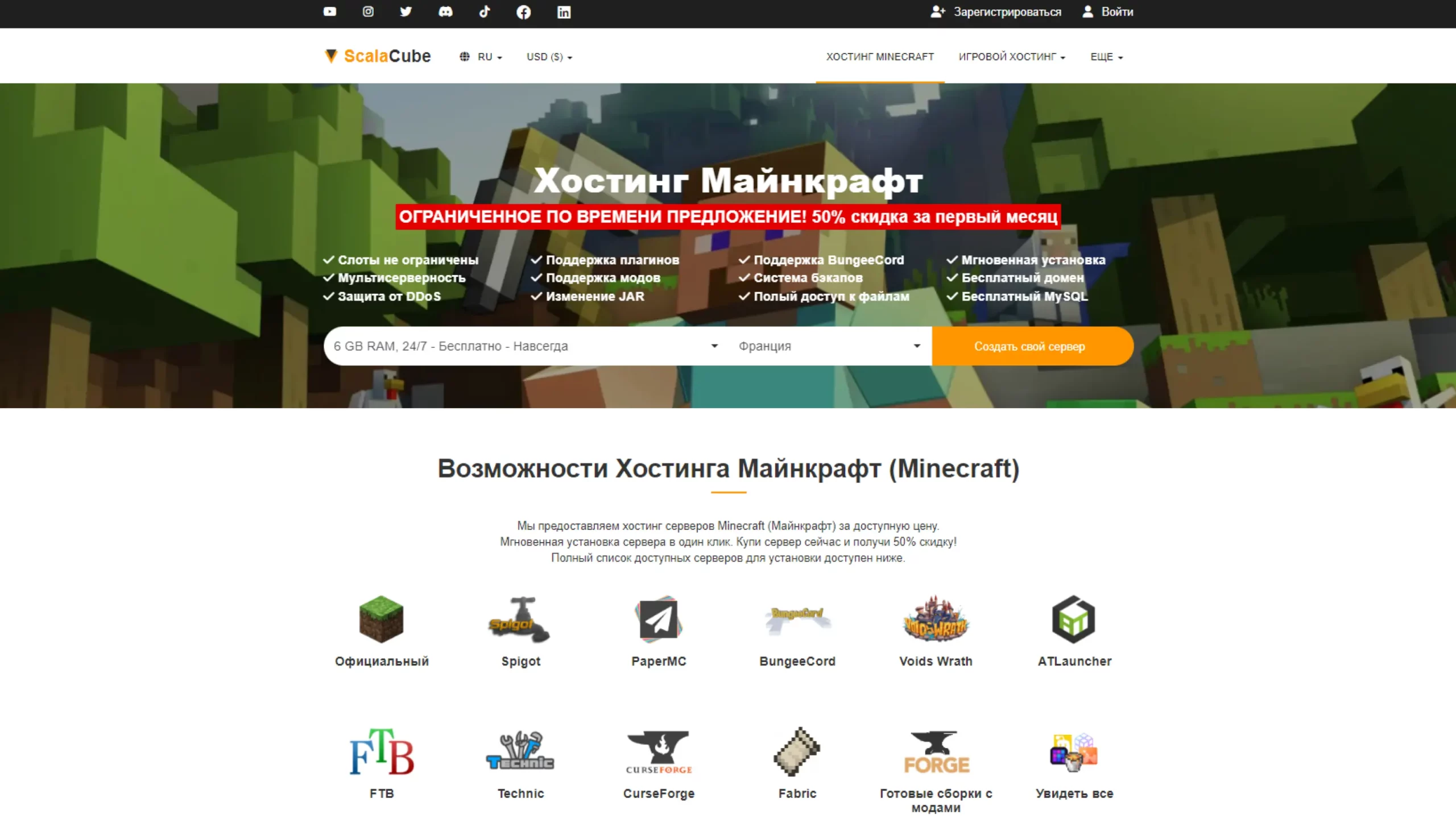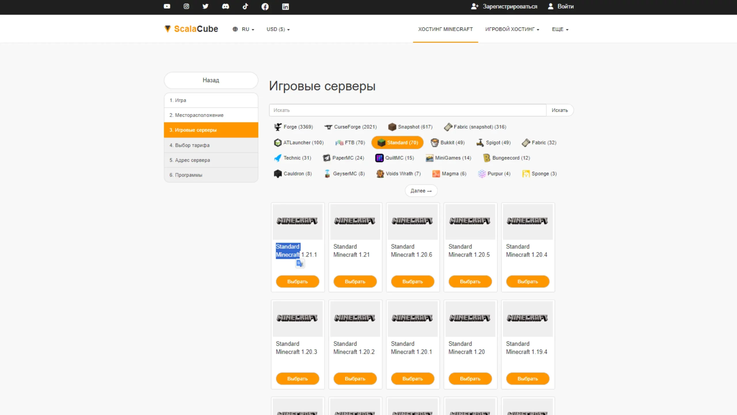 Для примера возьмем хостинг ScalaCube как самый гибко настраиваемый из предложенных. Помимо «ванильного» Minecraft, здесь вы сможете создать сервер сразу с ядром для модификаций и плагинов. При этом алгоритм будет схож для любого другого хостинга.