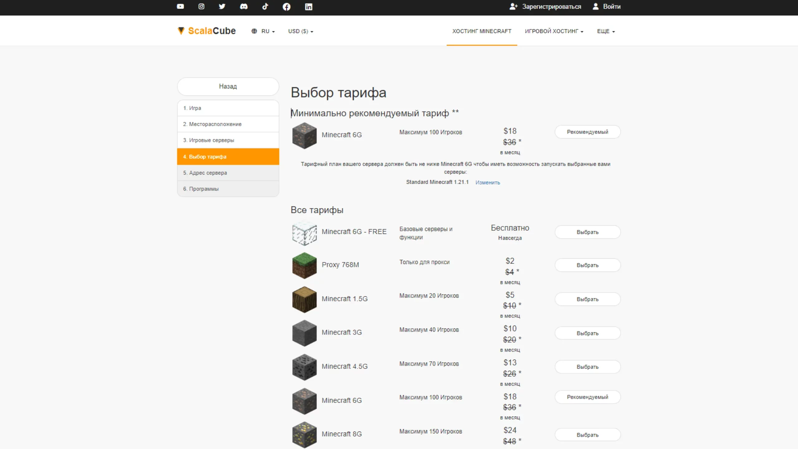 5. В окне с тарифами выберите Minecraft 6G — FREE.