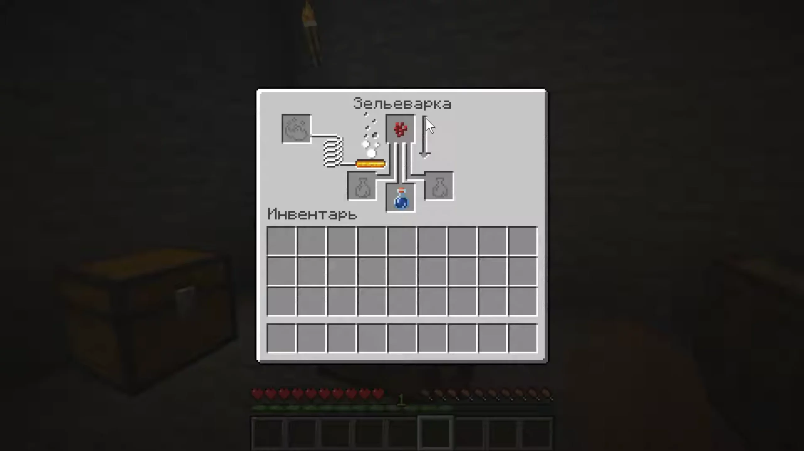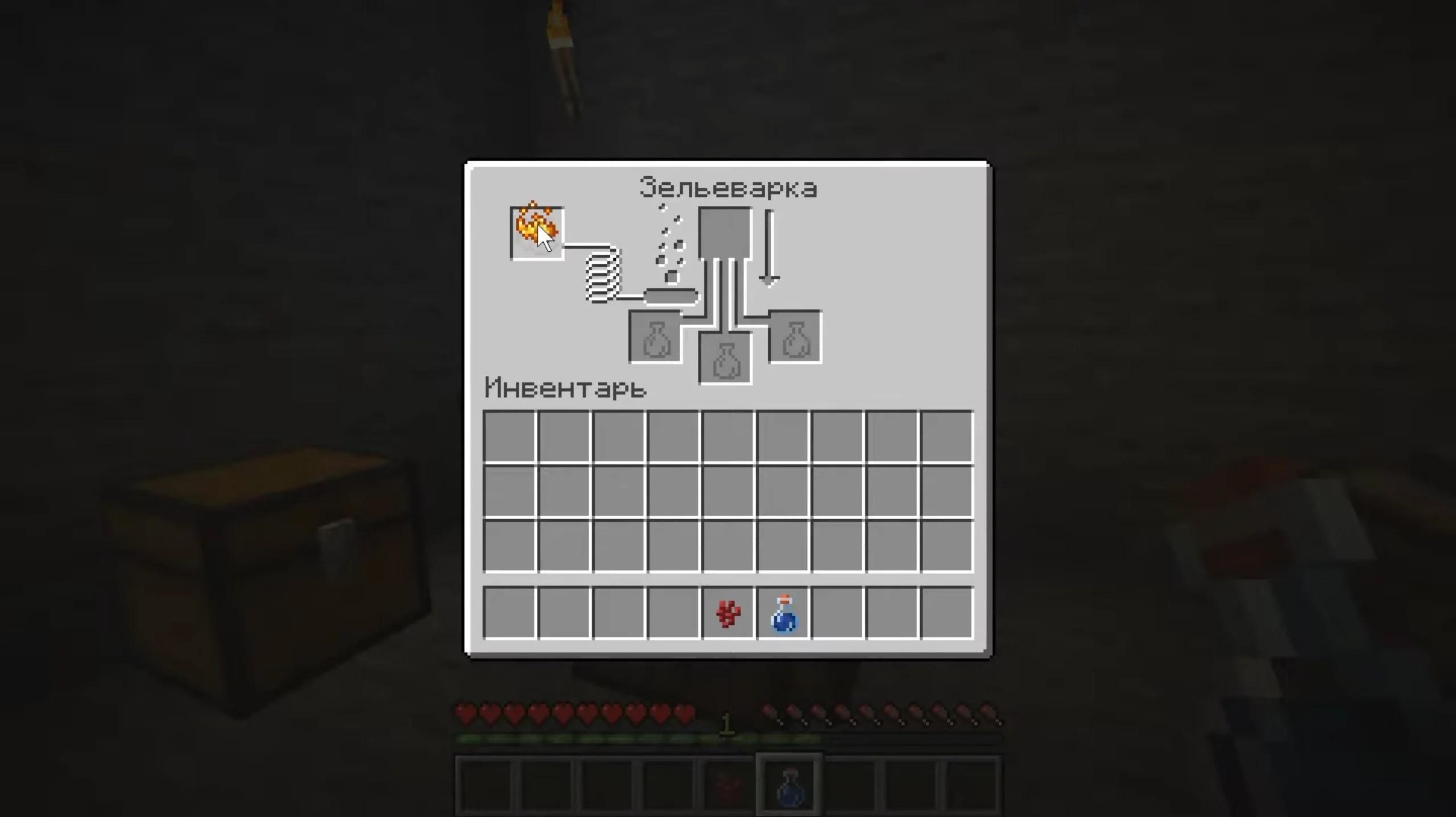 - Верхний центральный слот — для ингредиентов. Тут размещаются предметы, которые определяют или изменяют эффект зелья (например, адский нарост, красная пыль, светокаменная пыль).