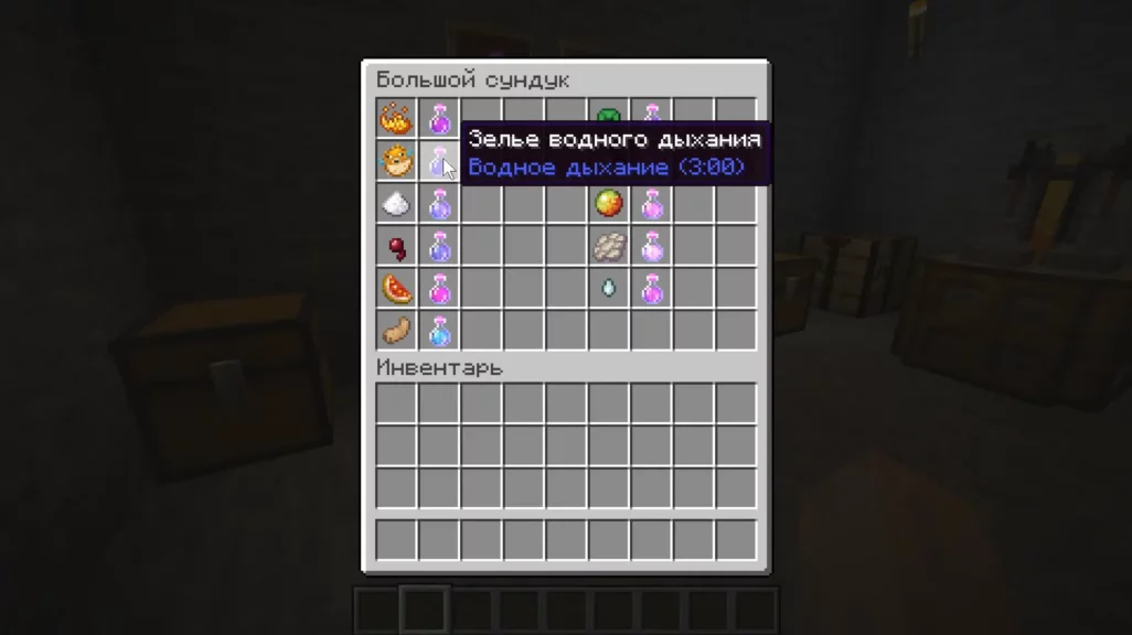 | Зелье подводного дыхания | Мутное зелье + иглобрюх | Дает подводное дыхание | 3 минуты |