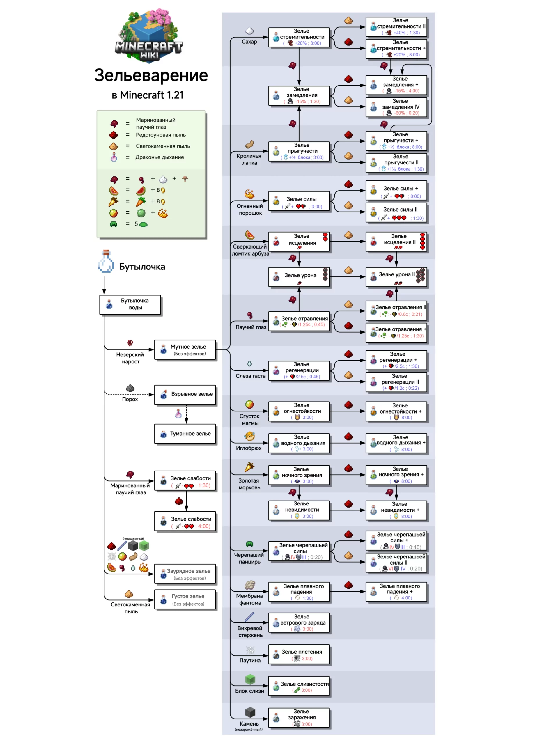 | Огненный порошок, сверкающий ломтик арбуза, редстоун и другие ингредиенты | Заурядное зелье | Это побочный продукт неправильной алхимии. Его легко сварить по ошибке, если забыть про адский нарост. Так что, если оно получилось, не страшно, но и пользы никакой. |