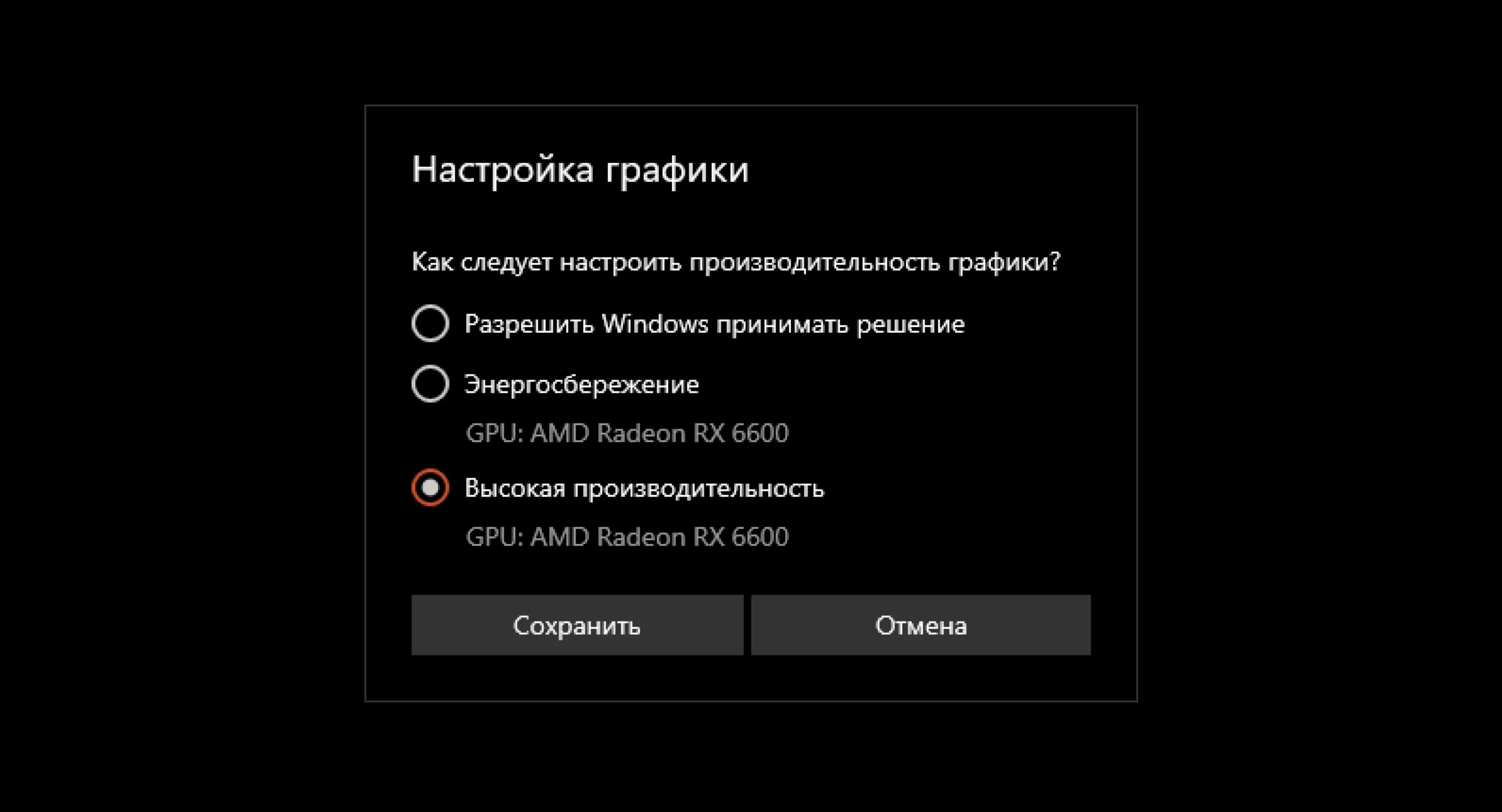 В окне приложения нажмите «Параметры», выберите режим «Высокая производительность» и нажмите «Сохранить».