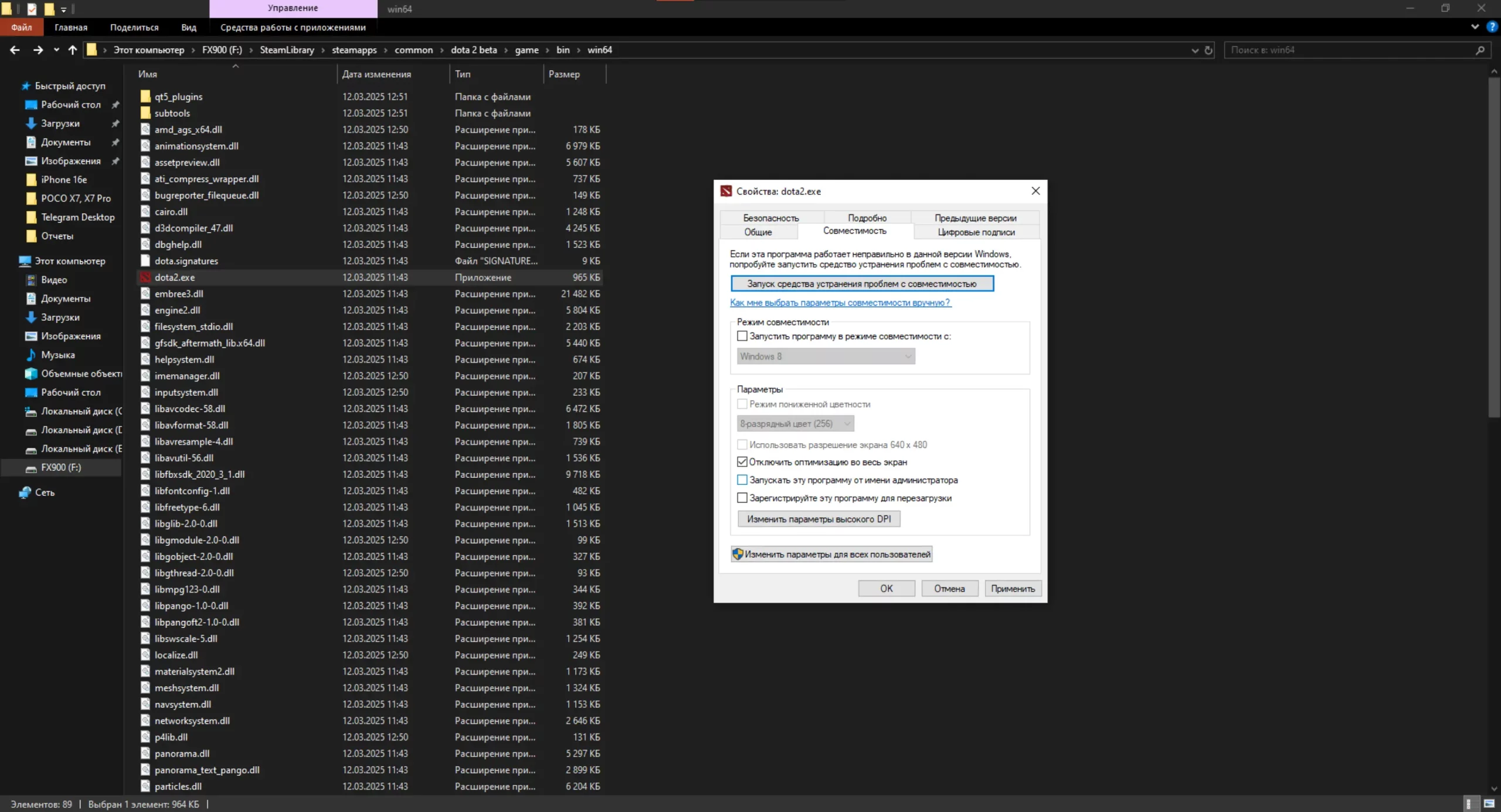 2. Кликните правой кнопкой мыши по приложению dota2.exe и нажмите «Свойства».