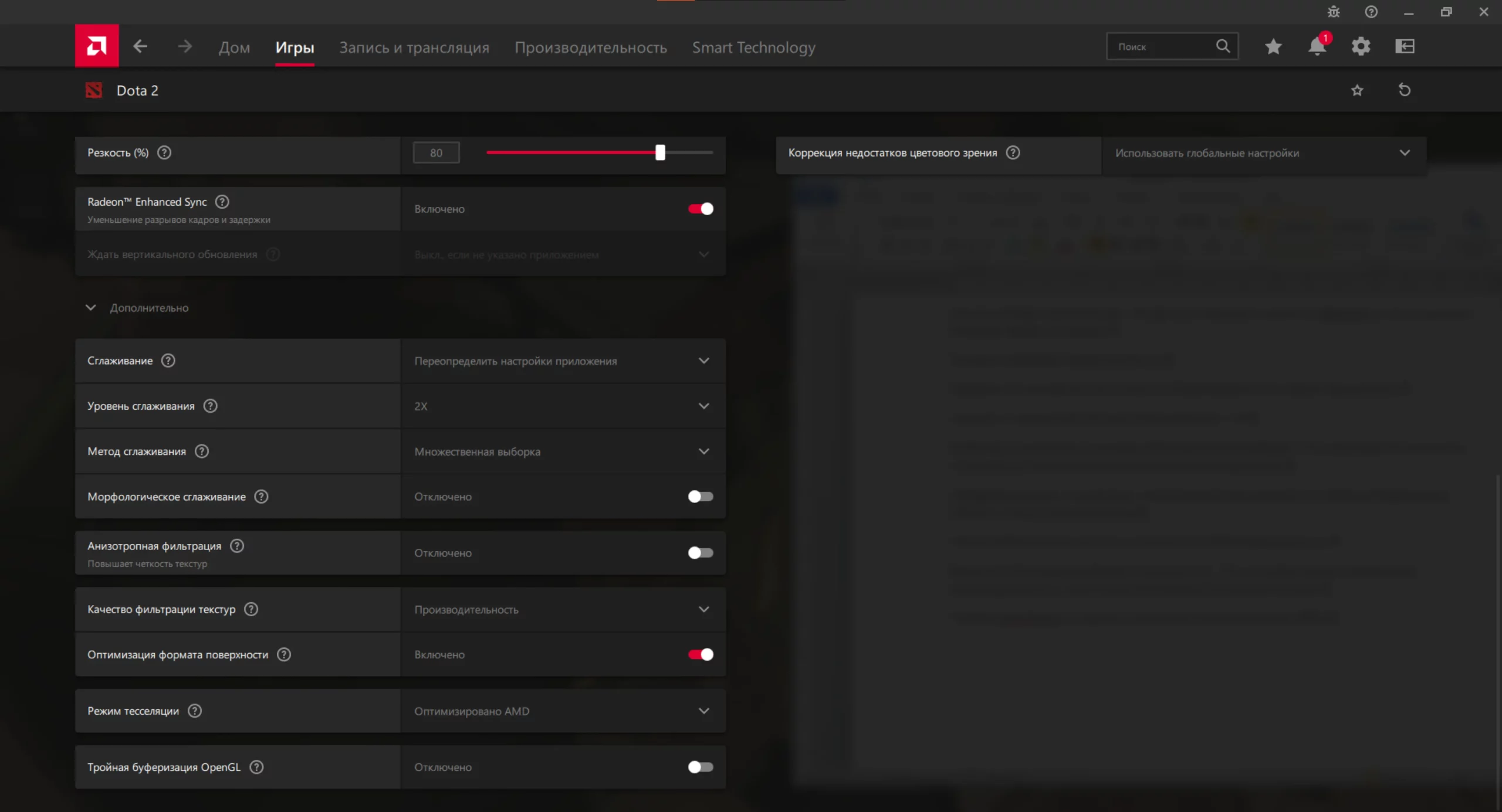 9. Параметр «Сглаживание» выставьте на «Переопределить настройки приложения».