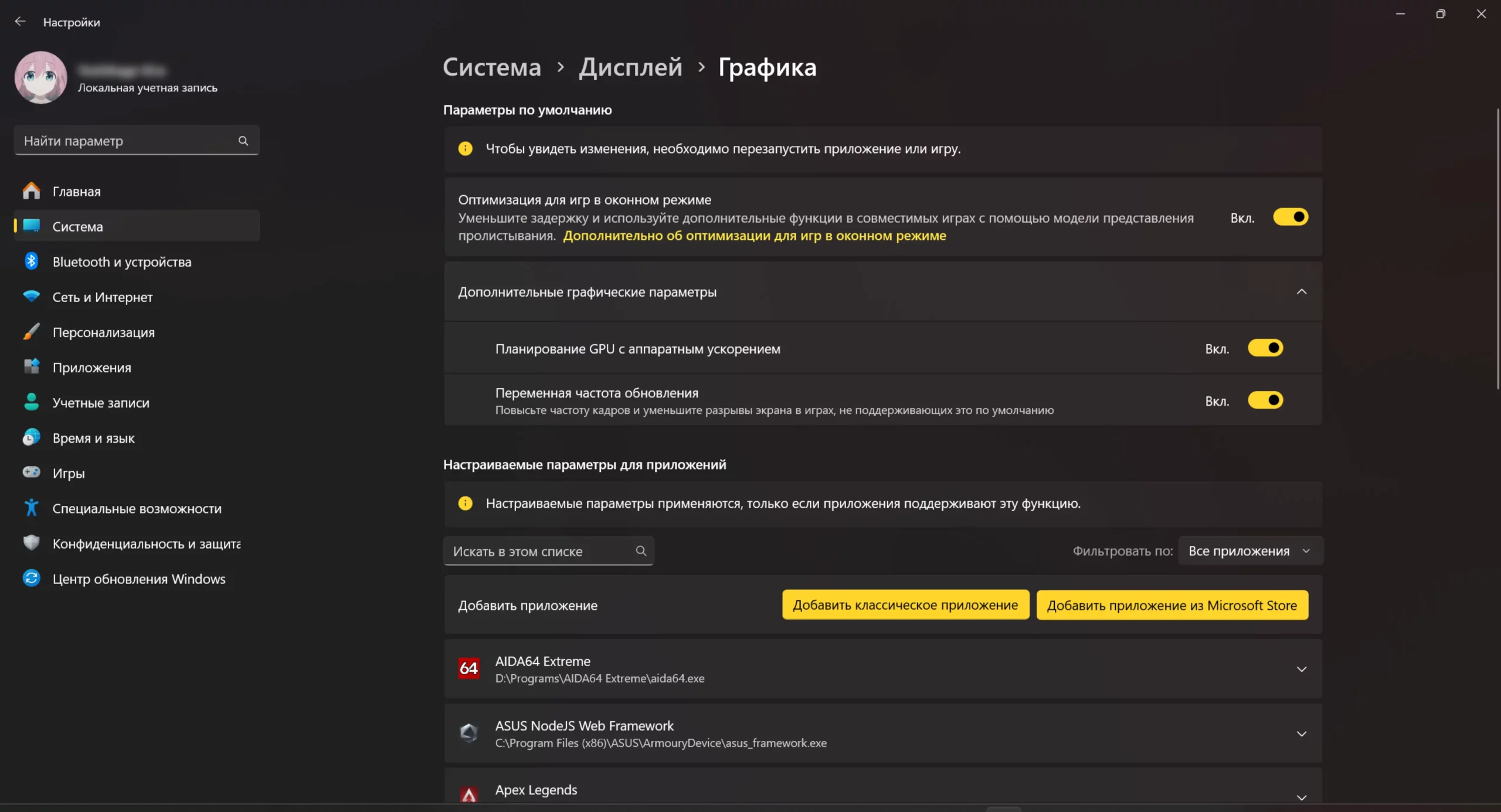 4. В меню включите «Планирование GPU с аппаратным ускорением» и «Переменная частота обновления», если такие параметры есть на вашей системе.