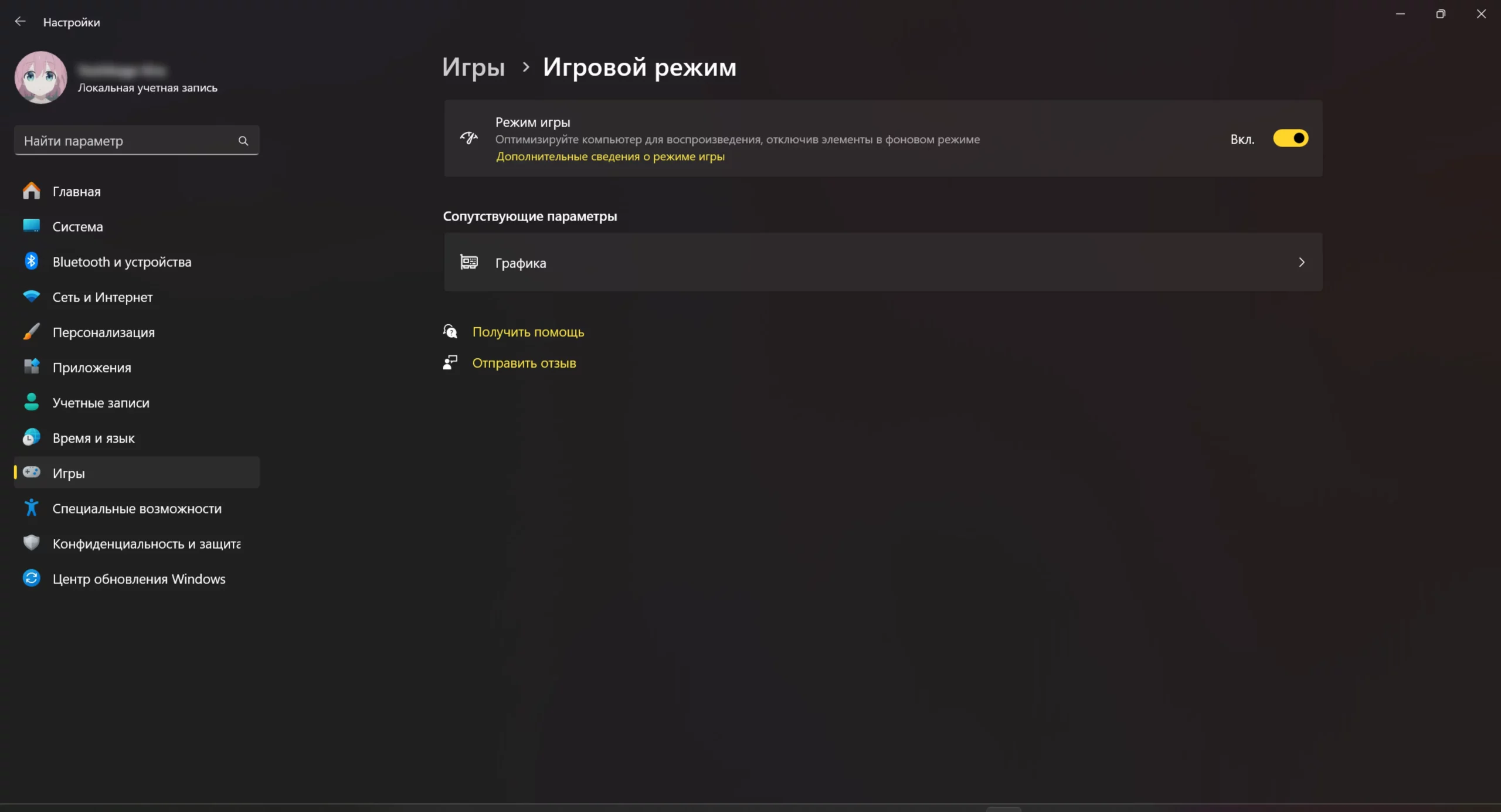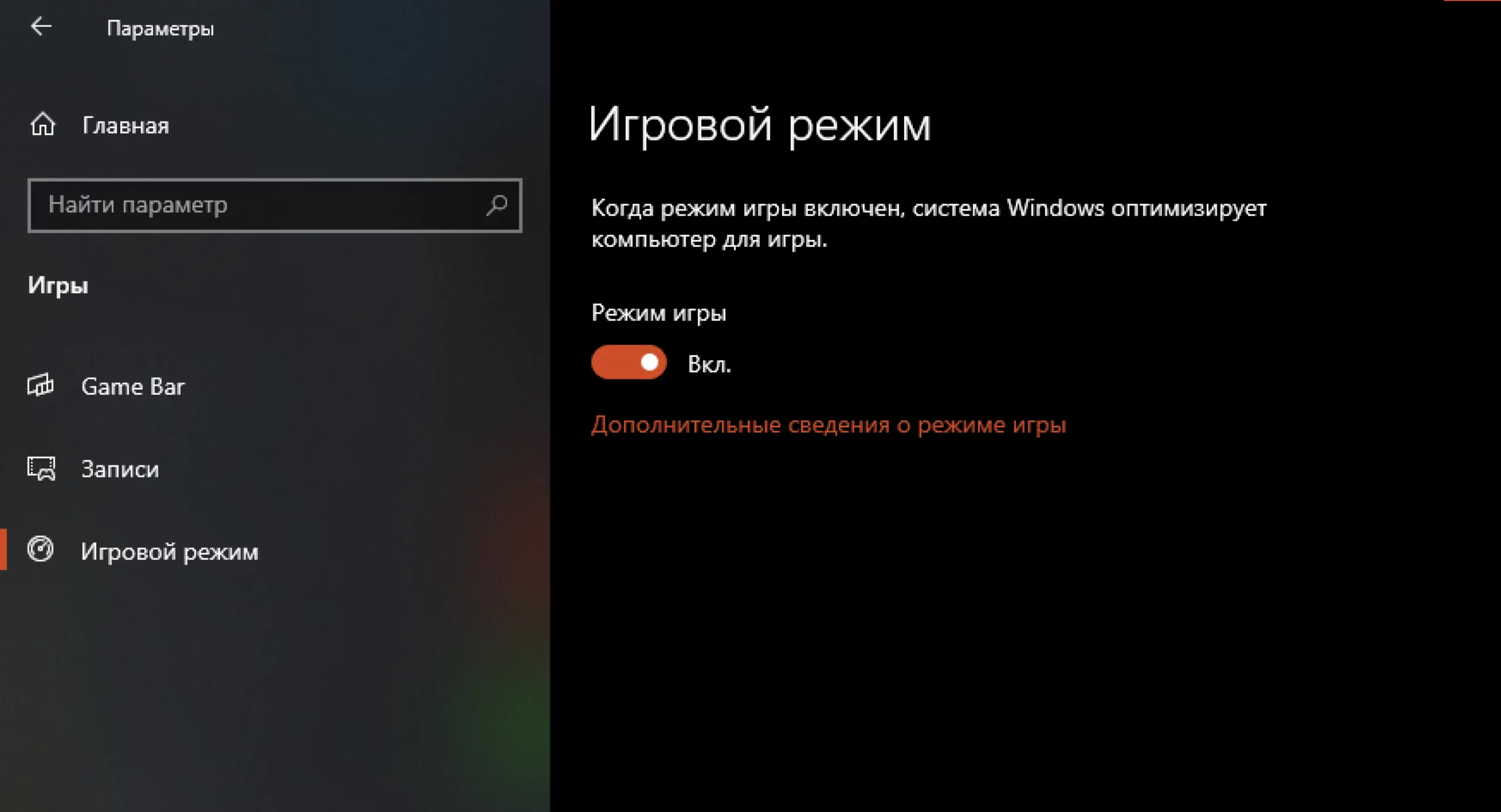 Тут же, в «Параметрах», перейдите во вкладку «Игры» → «Игровой режим» и включите параметр «Режим игры».