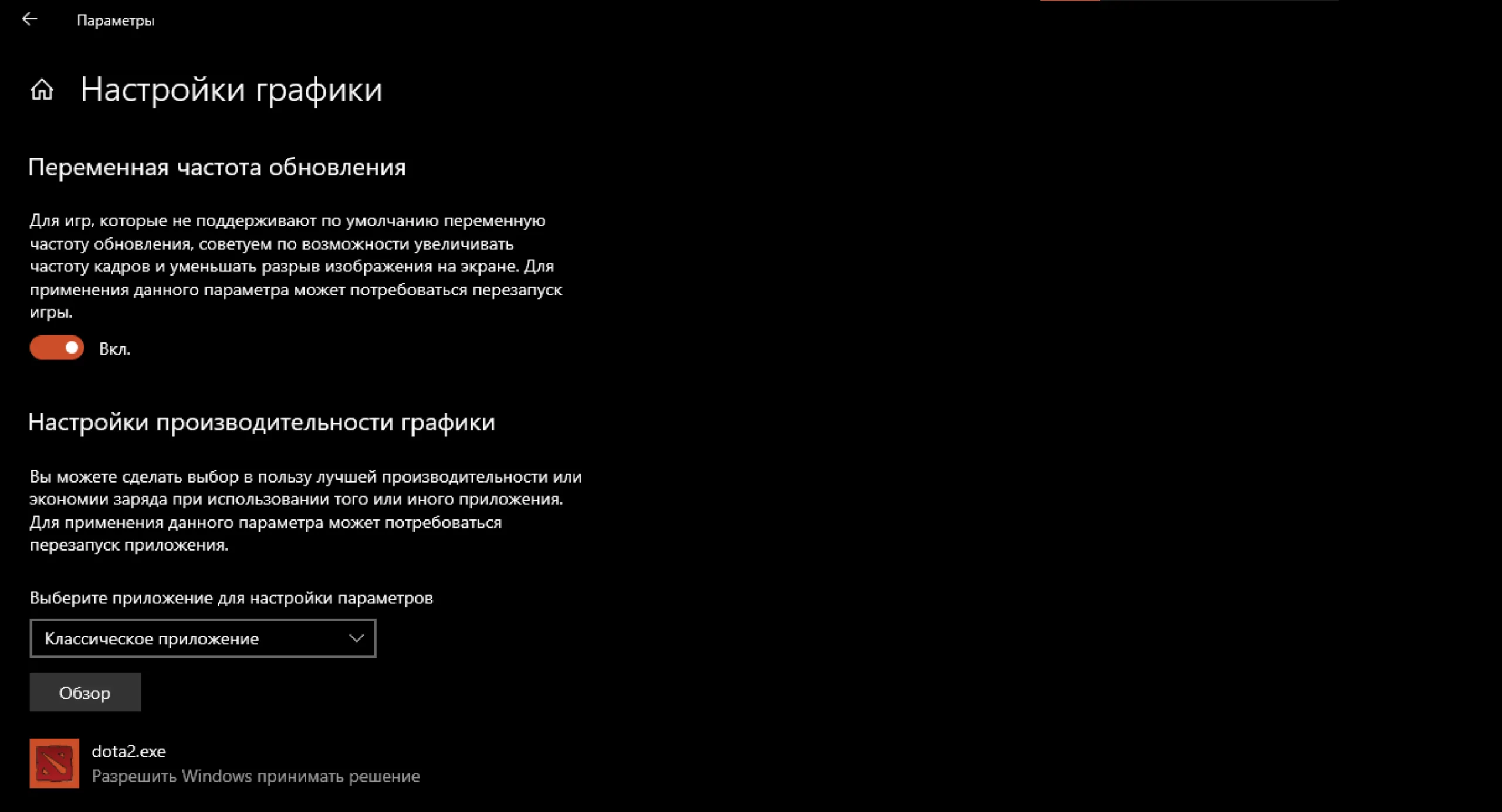 4. В пункте «Настройки производительности графики» выберите «Классическое приложение» и нажмите «Обзор», если приложения dota2.exe нет в окошке ниже.