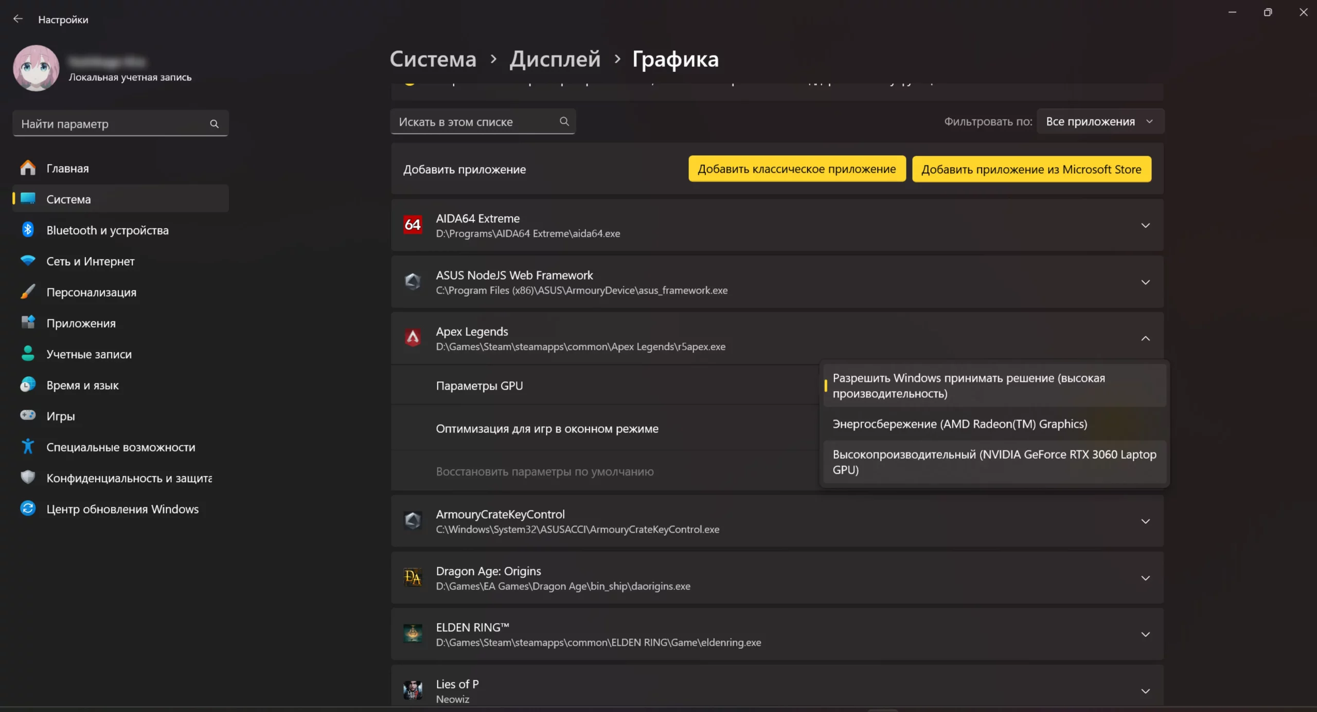 5. В пункте «Параметры GPU» выберите «Высокопроизводительный» режим работы.