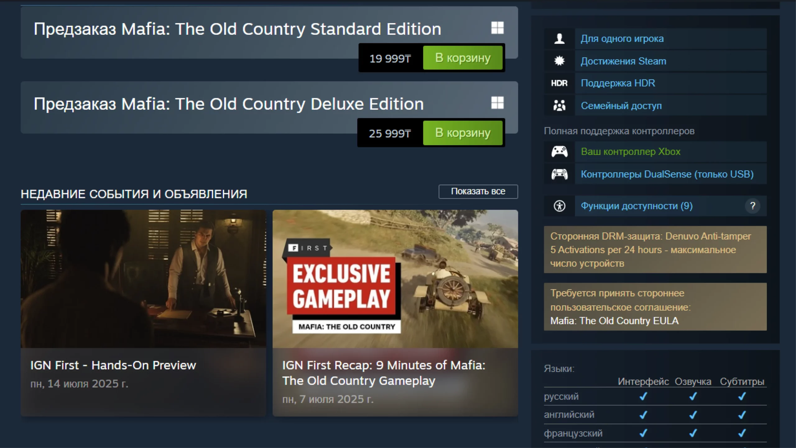 Ждать осталось совсем недолго — Mafia: The Old Country выходит 8 августа 2025 года. Причем это не просто ориентировочная дата — разработка уже завершена, игра ушла «на золото» еще в начале июля, так что переносов не предвидится. Это значит, что все основные работы закончены, а сейчас идут только полировка и подготовка к релизу. И да, релиз будет одновременный по всему миру; при этом сразу будет доступна полная русская локализация — спасибо Hangar 13 и 2K.