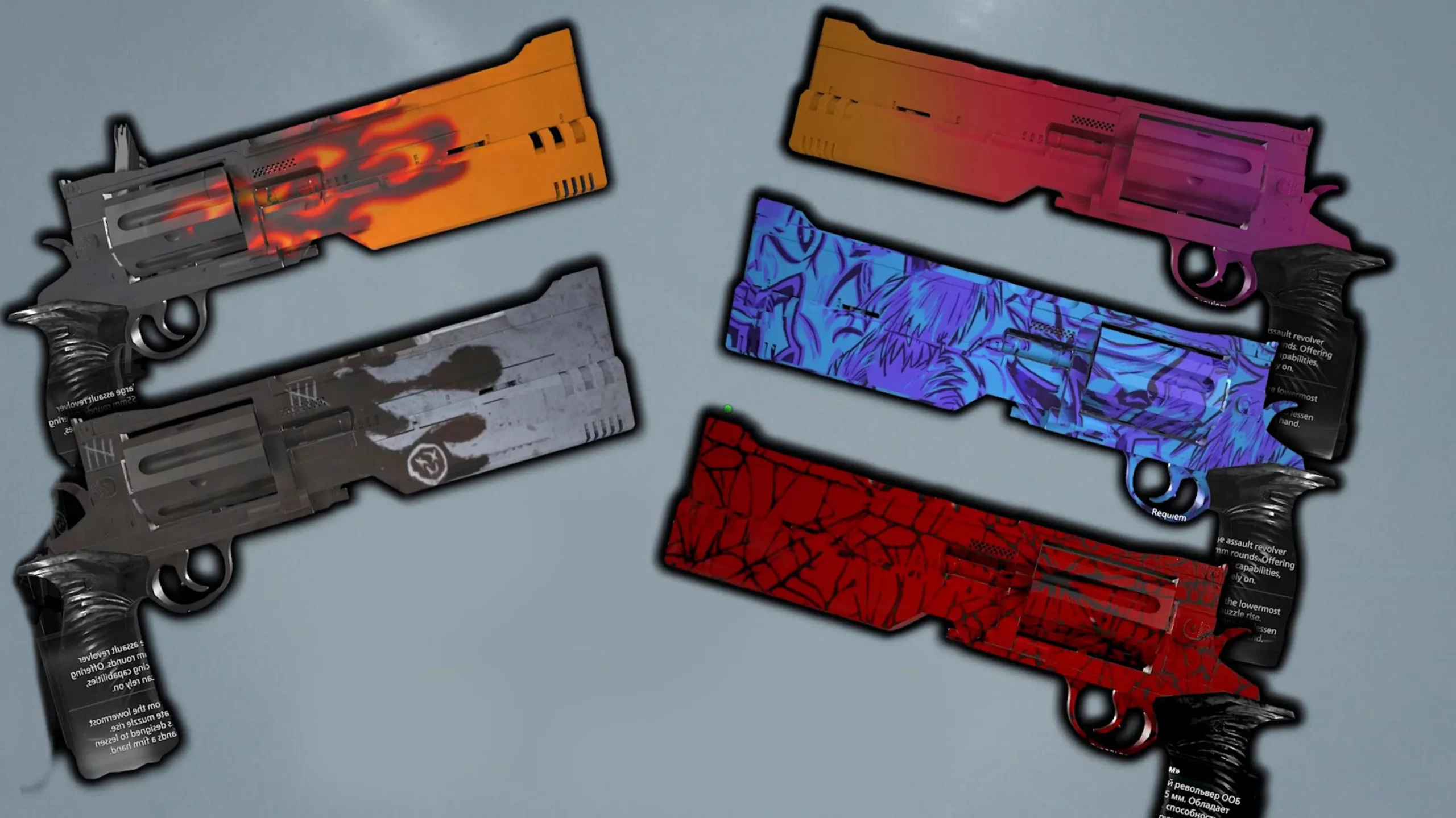 В свое время именно Counter-Strike сподвигла разработчиков онлайн-шутеров на массовое внедрение «скинов» — раскрасок для оружия. Resident Evil Requiem далека от подобных трендов, но и среди фанатов хорроров нашлись любители цветастых пушек. Например, автор мода Requiem skins CS2 pack сделал несколько камуфляжей для револьвера «Реквием». Дизайны взяты прямиком из Counter-Strike 2. Языки пламени, цветной градиент, кровавая паутина — выбрать есть из чего.