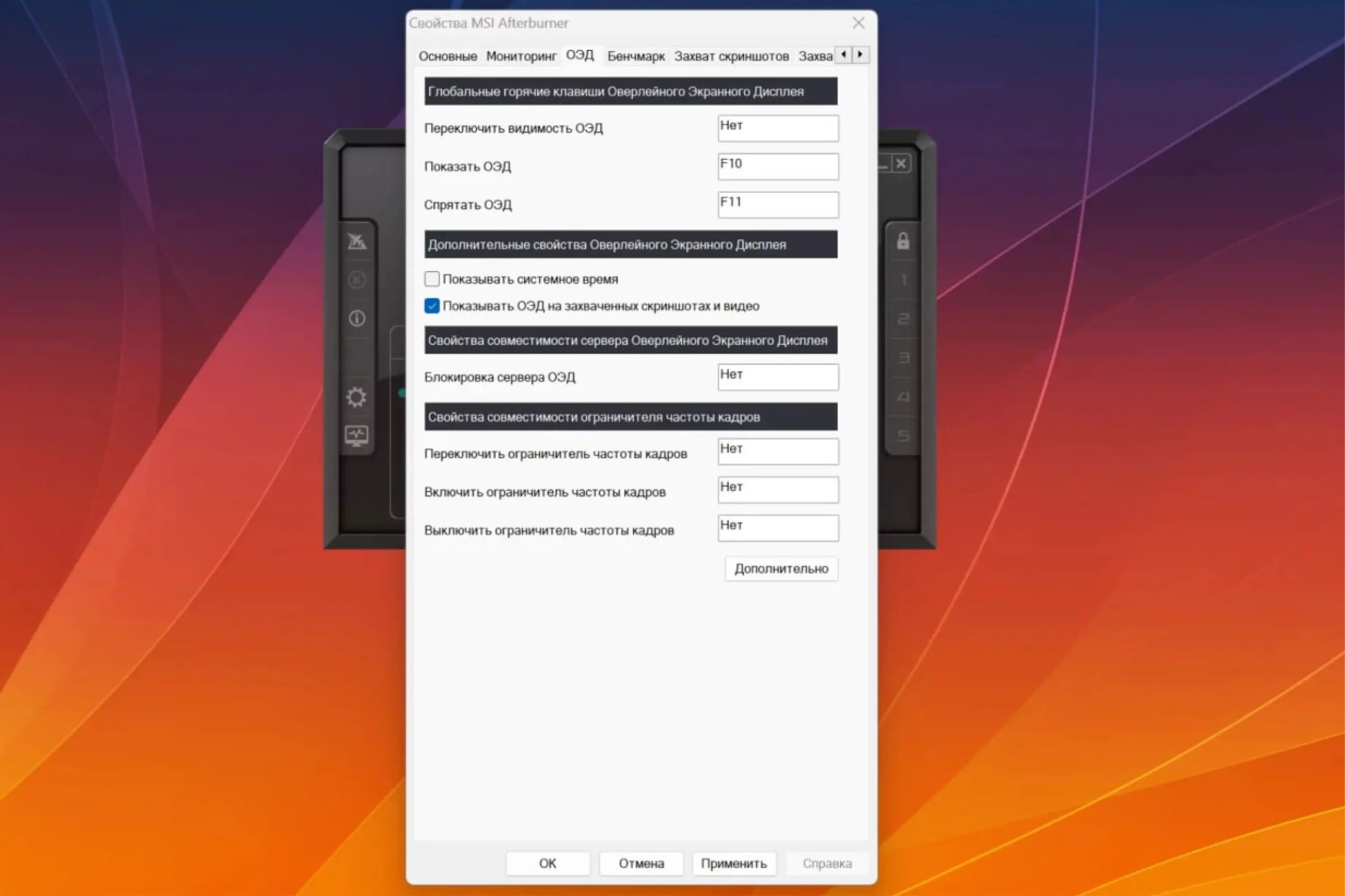 Выводимые MSI Afterburner на экран данные можно скрыть, когда в этом нет необходимости. Для этого в настройках назначьте горячие клавиши, чтобы показать или спрятать вкладку ОЭД. Там же можно сделать отметку «Показывать ОЭД на скриншотах».
