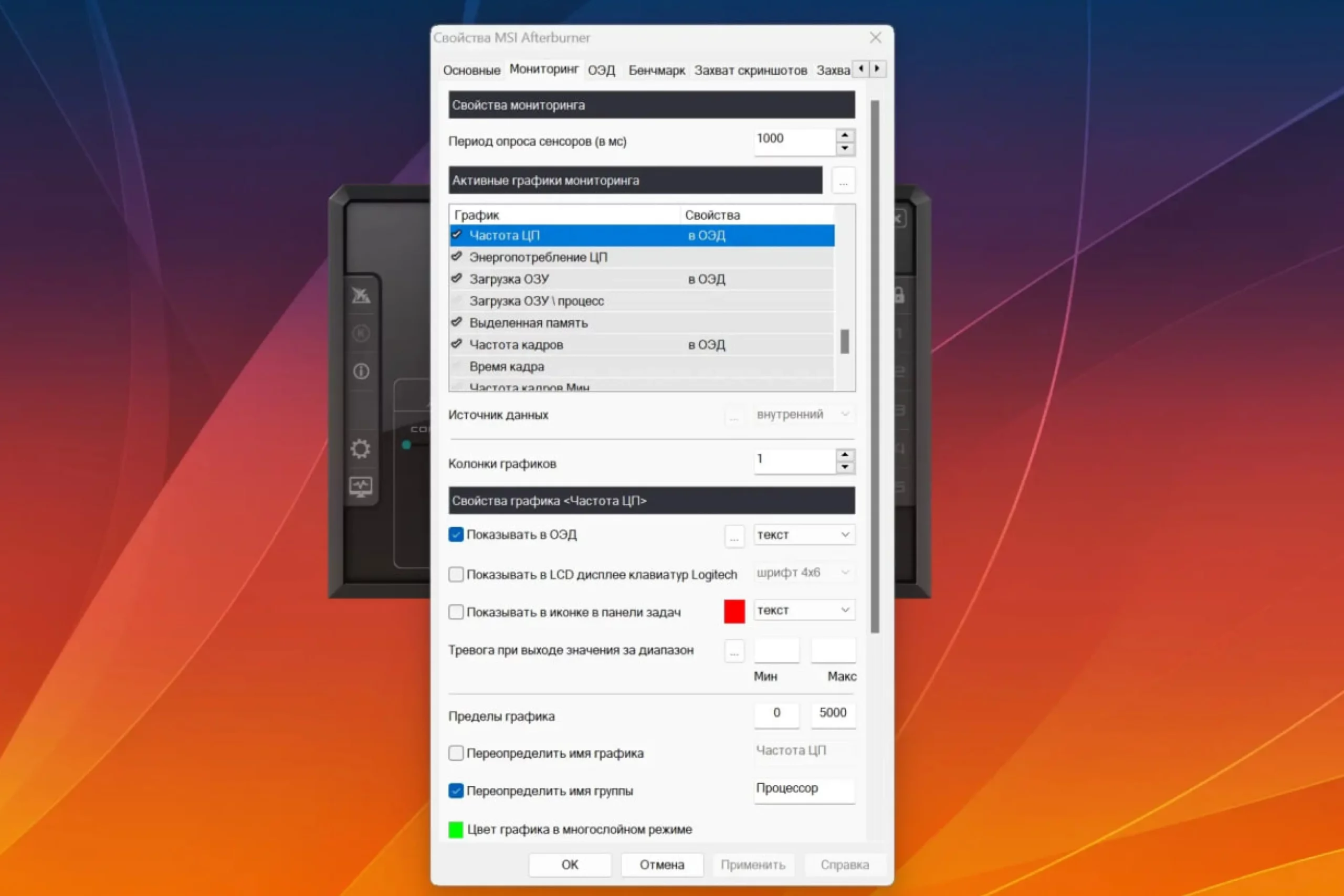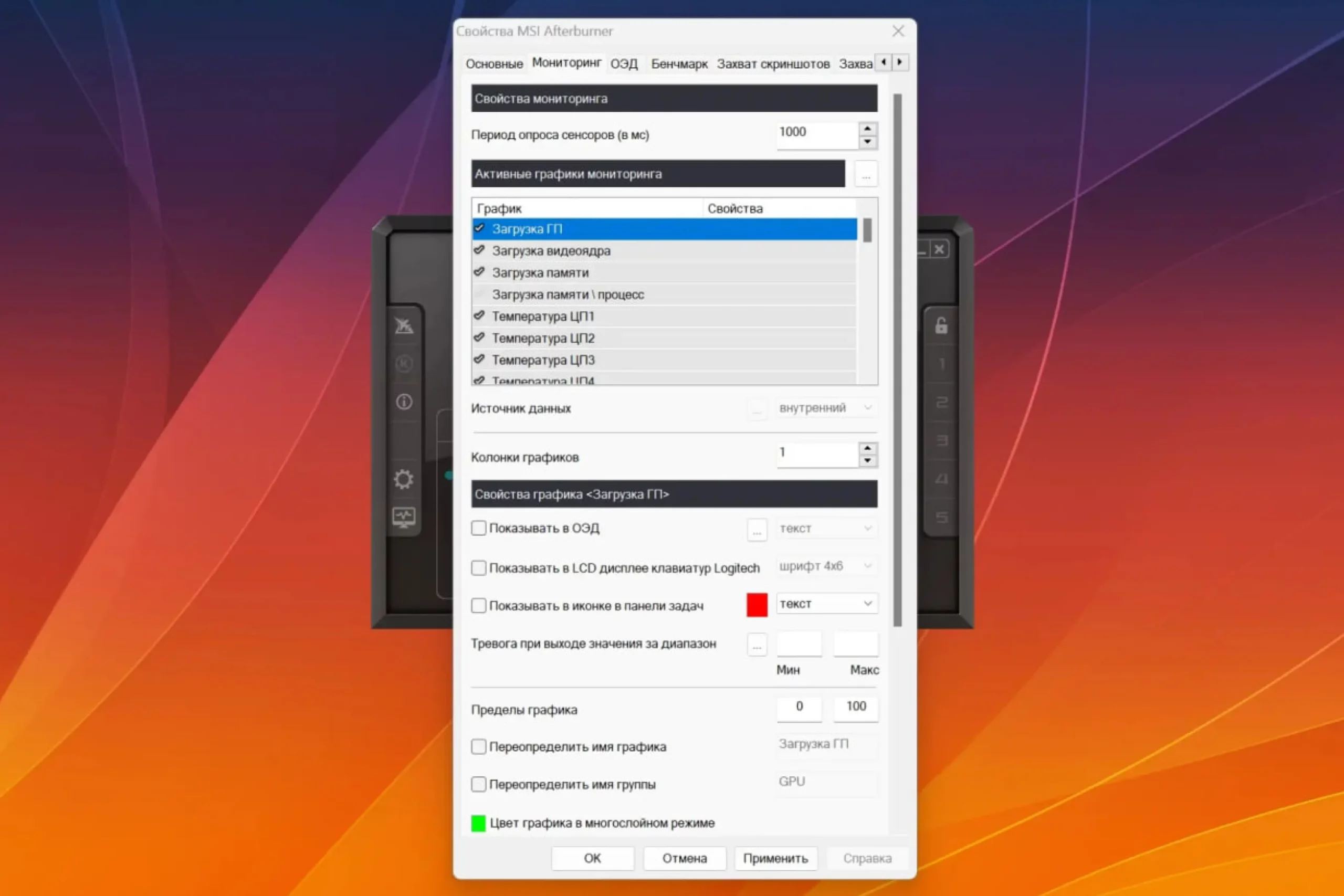 Контролировать температуру графического процессора важно, поскольку этот параметр напрямую отражает эффективность работы видеокарты, а перегрев может привести к ее поломке. Во время игры температура должна находиться в пределах 75−85° в топовых картах и 65−75° — в бюджетных. Если значения выше, то стоит позаботиться о более эффективном охлаждении или о снижении частоты. Для отображения параметра на экране в разделе «Активные графики мониторинга» отметьте галочкой пункт «Температура ГП», а ниже выберите «Показывать в ОЭД». Аналогичным образом включаются все нужные параметры.