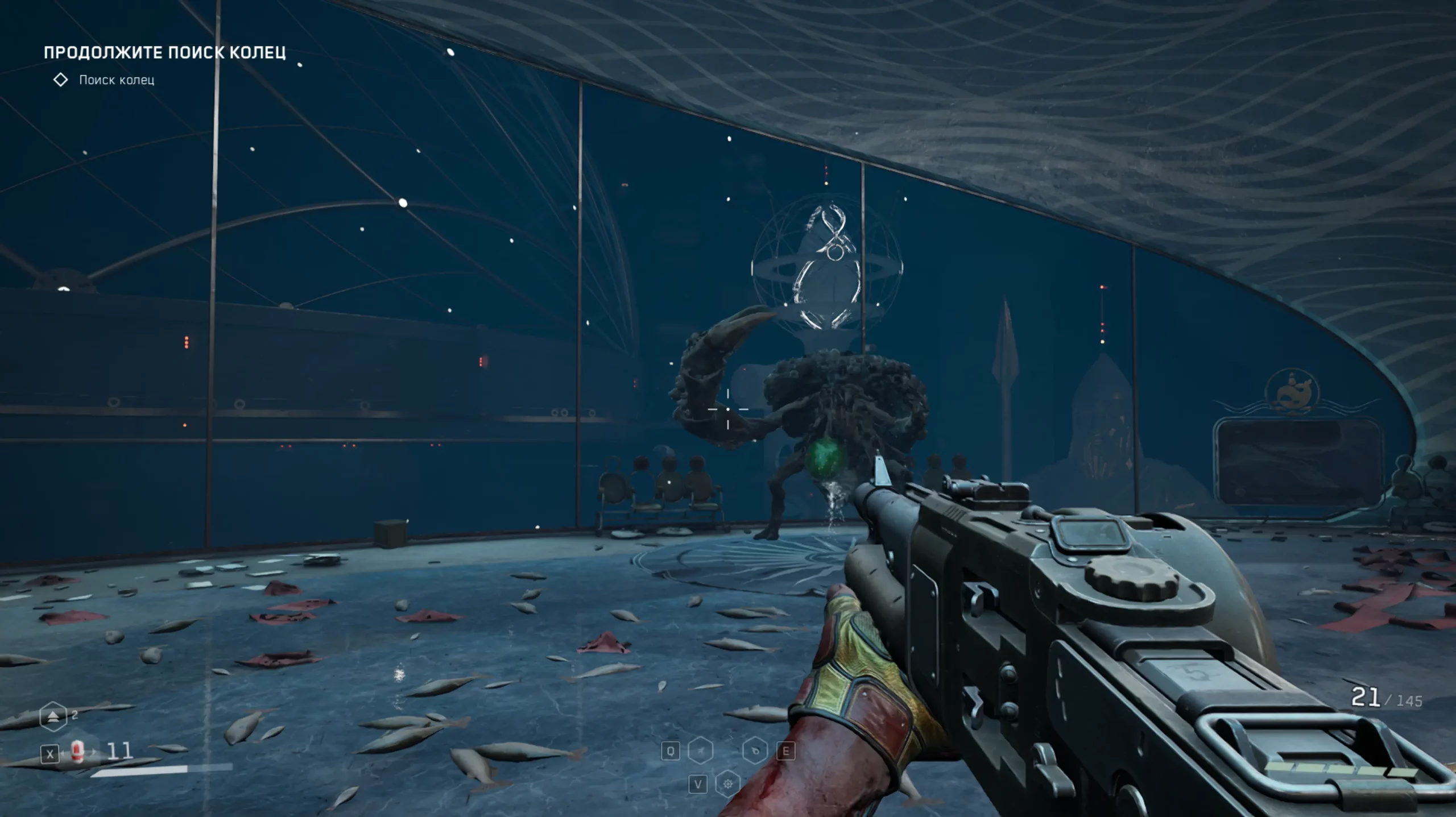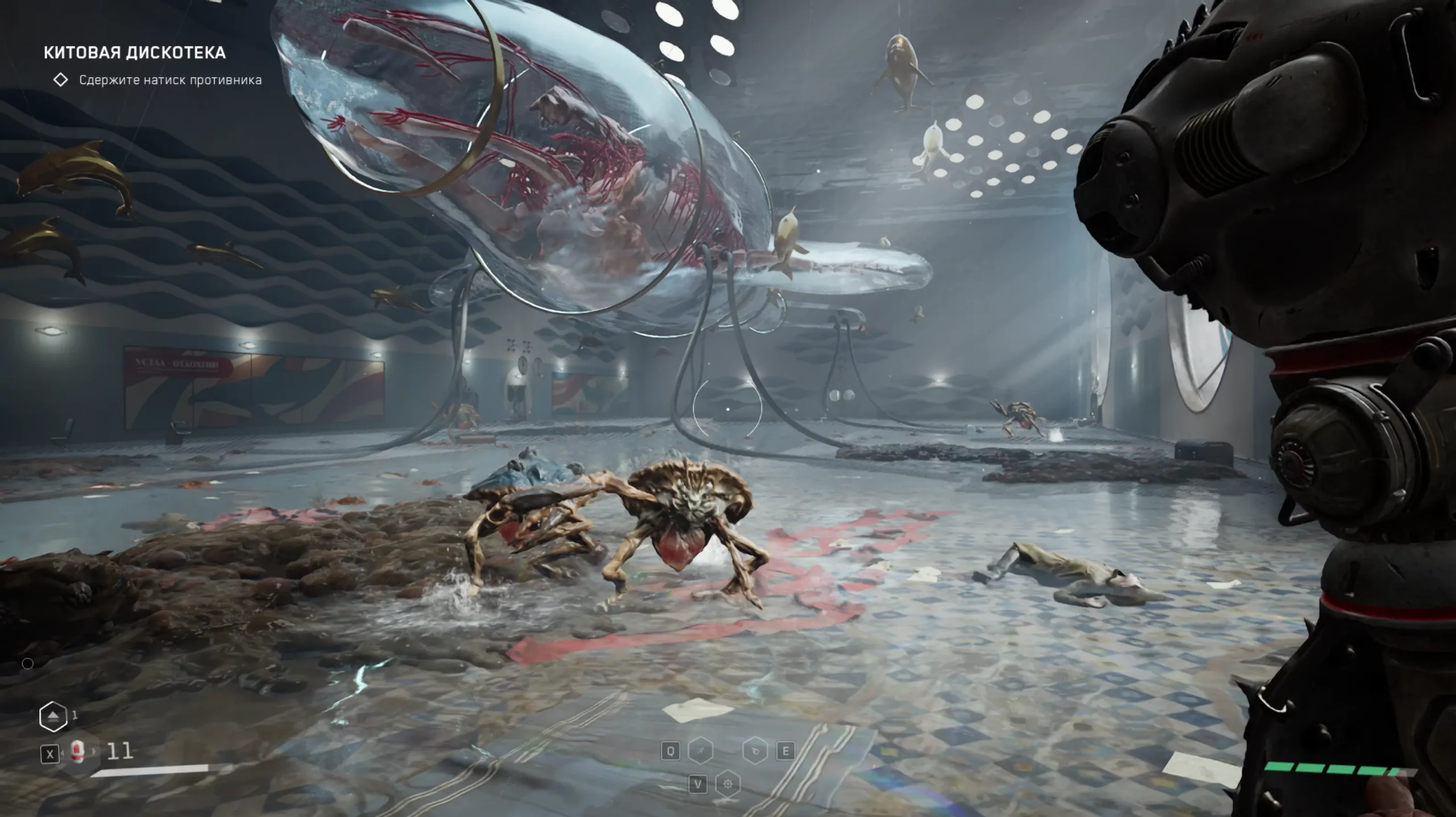 Встреч с огромным боевым крабом в дополнении несколько, и каждая представляет собой длительное многофазное сражение. Ведь именно за контактные и напряженные сражения игроки и полюбили Atomic Heart. Хоть в «Чарах морских глубин» нет недостатка в патронах, ближний бой все еще остается важнейшей частью игрового процесса. Этому способствуют и эффективность, и банальная смачность, с которой герой вламывает роботам, мутантам и гигантским морепродуктам. К этому же подталкивают и новые способности, действующие сразу на группы врагов.