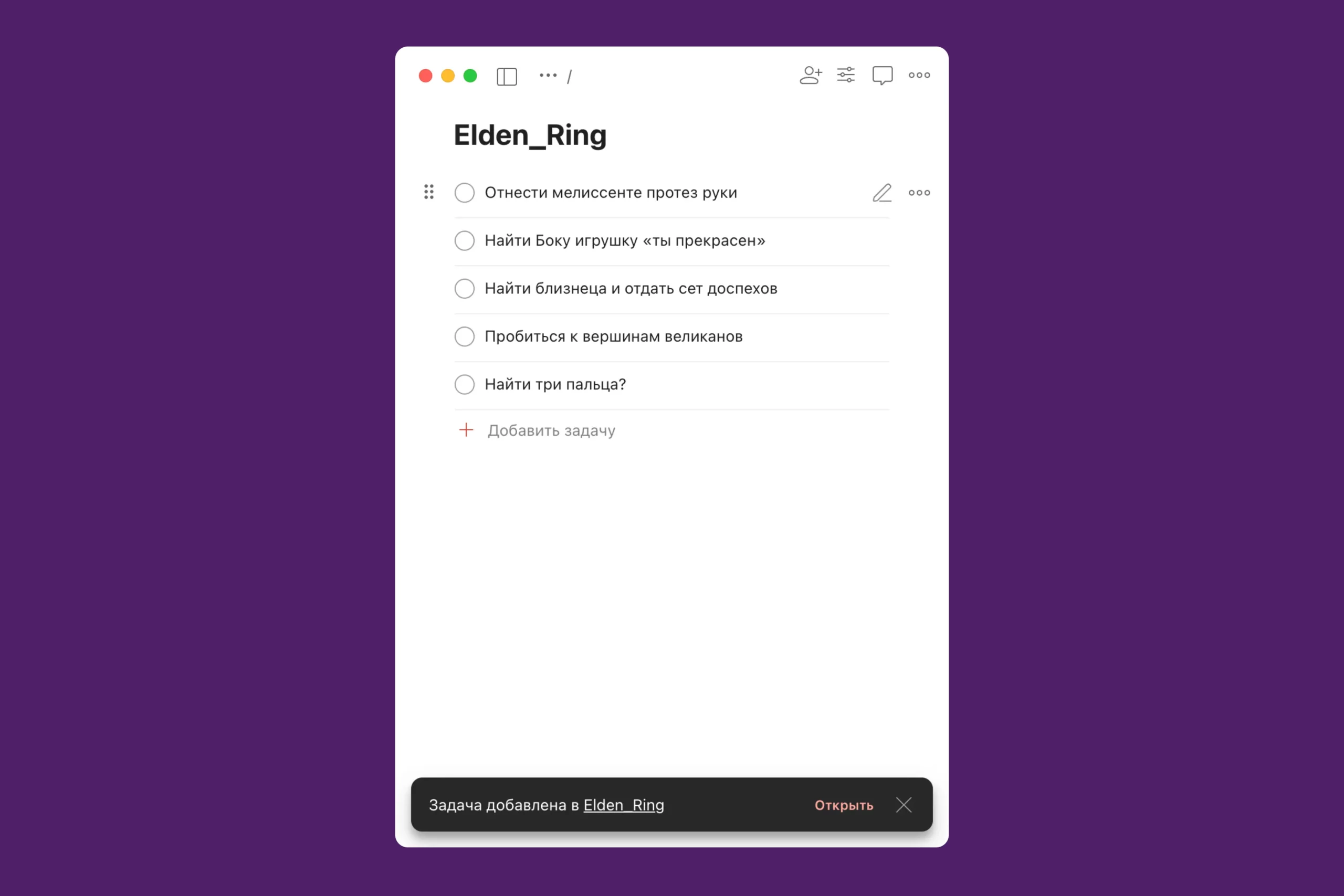 Я решил, что буду вести записи всех квестов самостоятельно. Я использую приложение Todoist, в котором записываю все свои рабочие задачи. Создал отдельную вкладку под Elden Ring и записываю туда все квесты. Нашел протез, который просила Меллисента, — записал. Мне сказали найти три пальца — записал. И так далее. Получается собственный квестовый журнал, полное погружение.