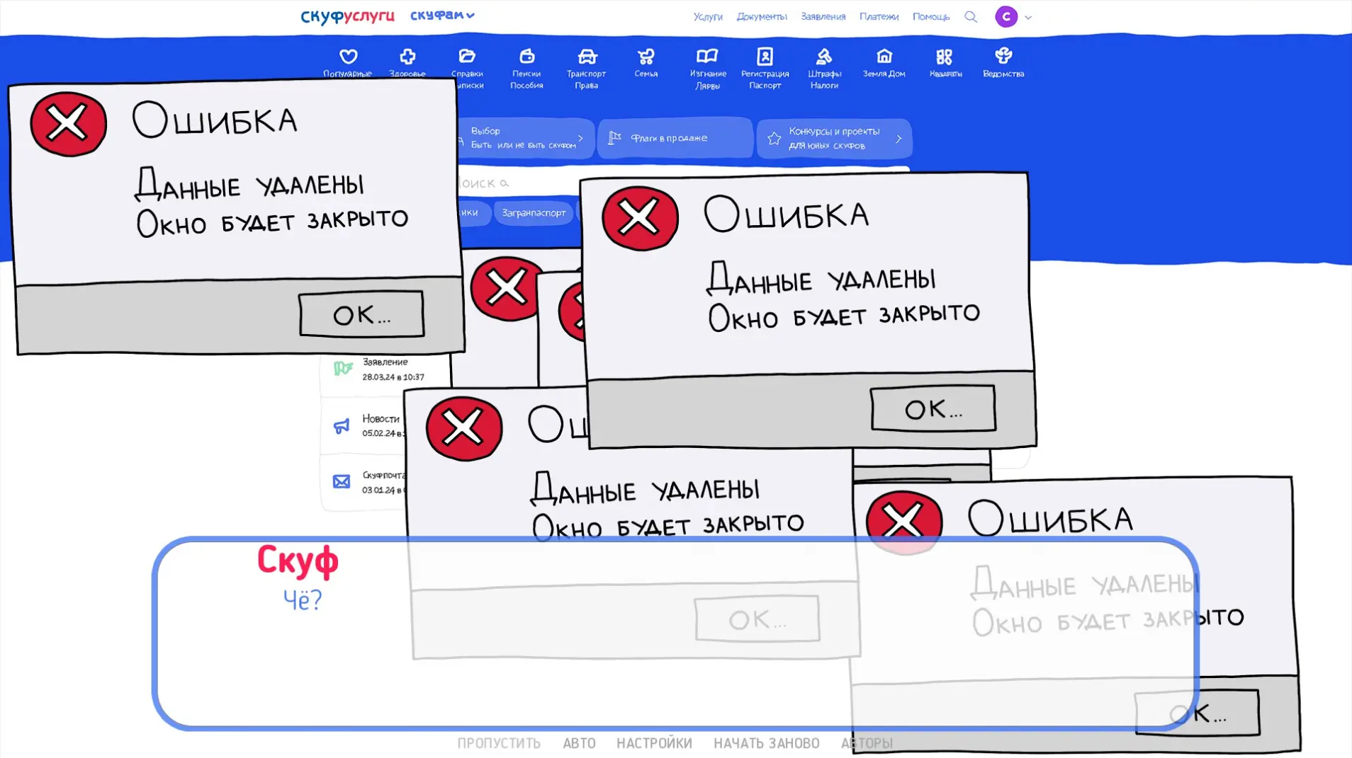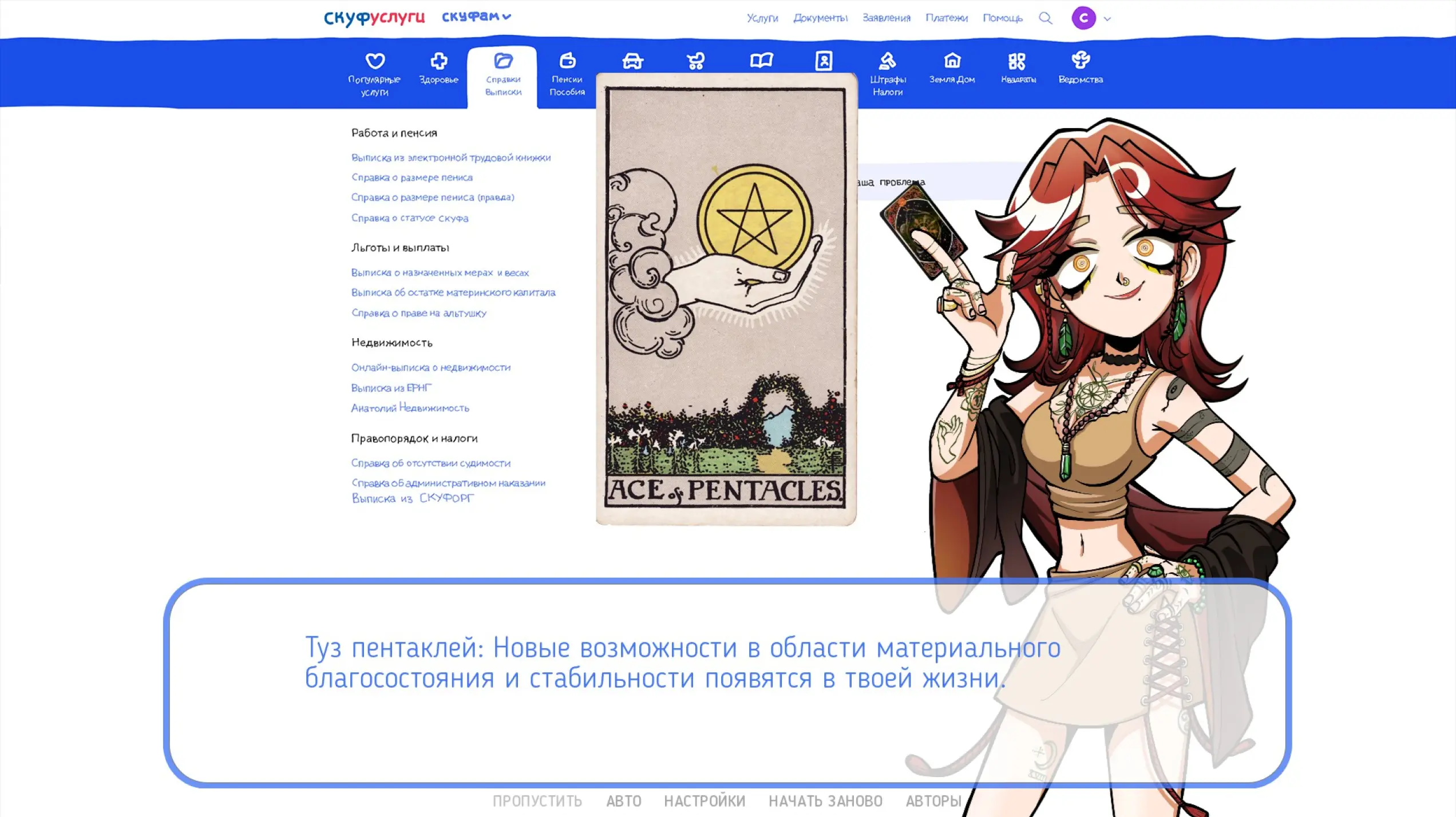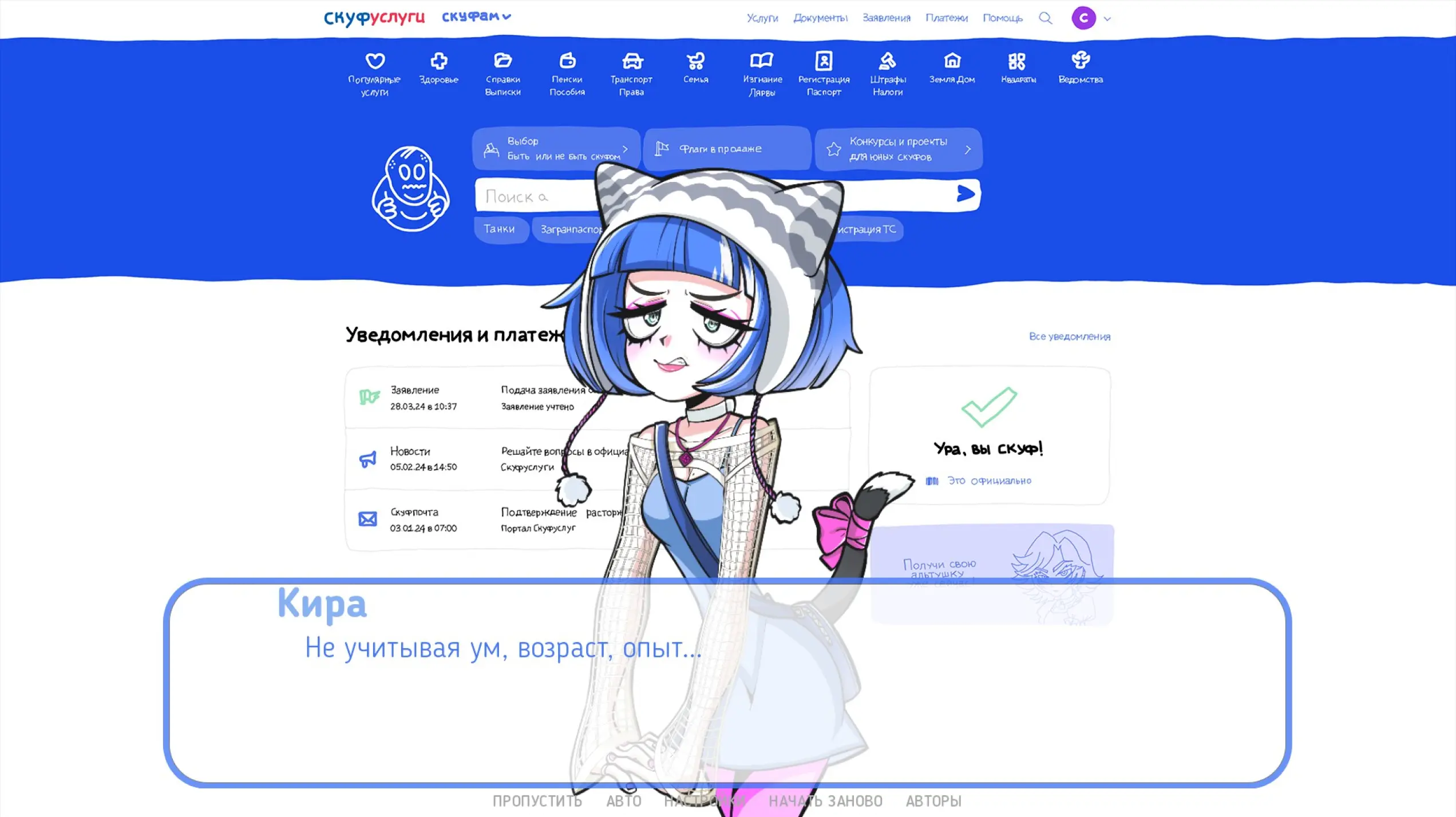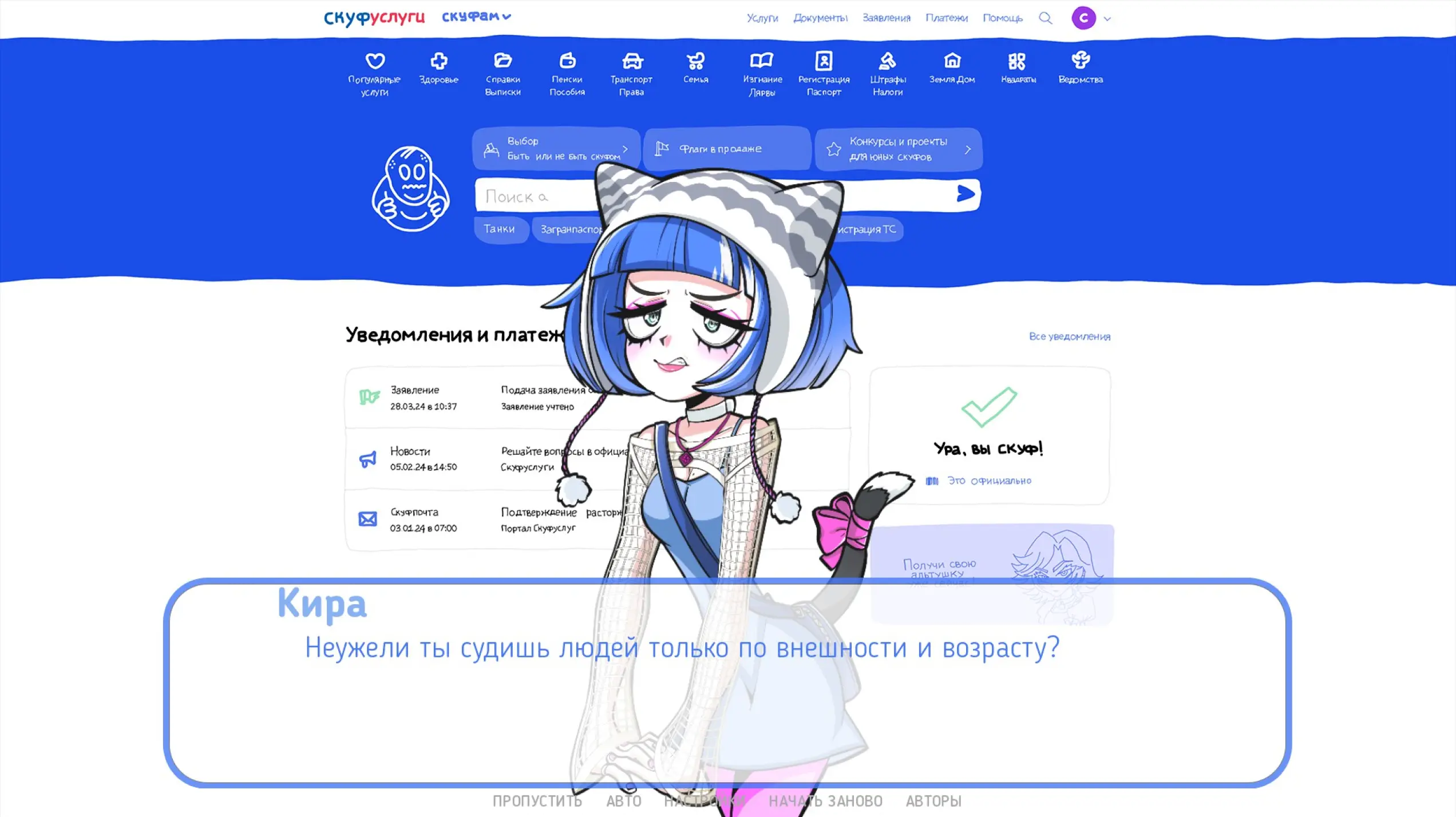 Нельзя назвать этого персонажа примечательным. Диалоги скучные — ты не сопереживаешь героям, поэтому их личное мнение о чем-либо становится фоновым шумом во время прокликивания. Зато почти каждый раздел на сайте раскрывает подробности о мире и сервисе. Так, мы узнаем, что у Скуфа была жена и, возможно, дети. К тому же на одной из вкладок можно увидеть, что совсем недавно герой развелся.
