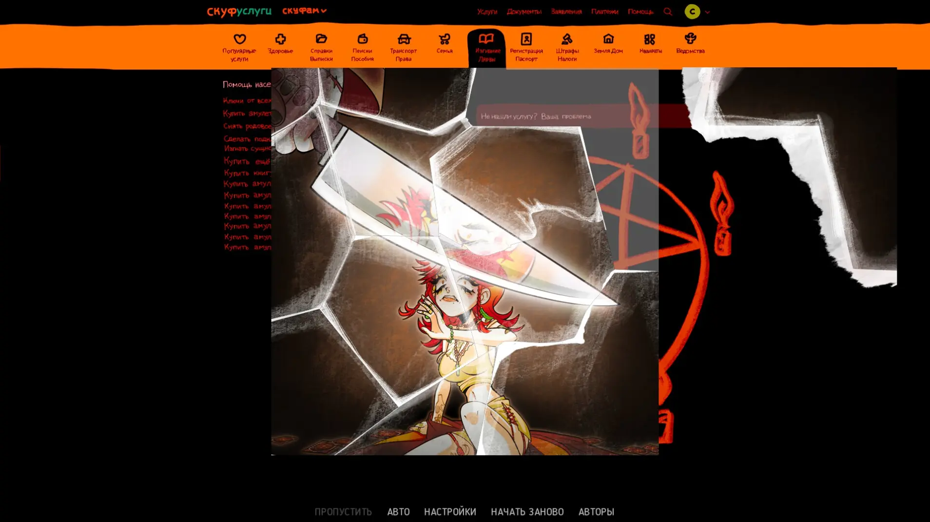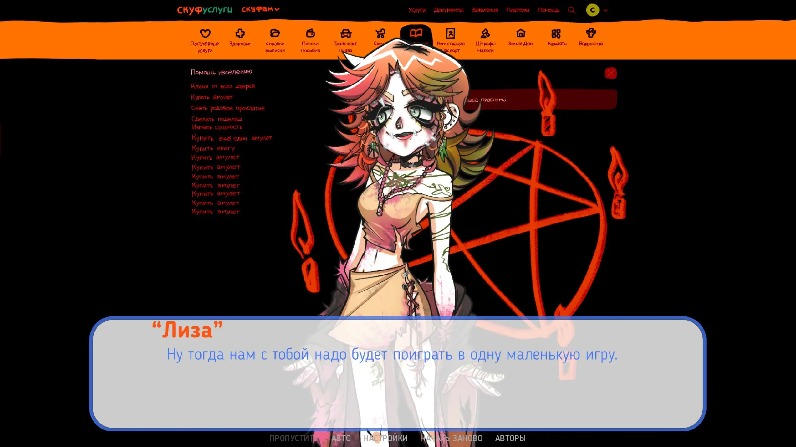 После Лиза предлагает заполнить один из двух разделов: «Пособия и пенсии» и «Изгнание лярвы». В первом варианте Скуф попадает в онлайн-казино, во втором — Лизу заменяет ее жуткая копия, которая доводит героя до смерти.