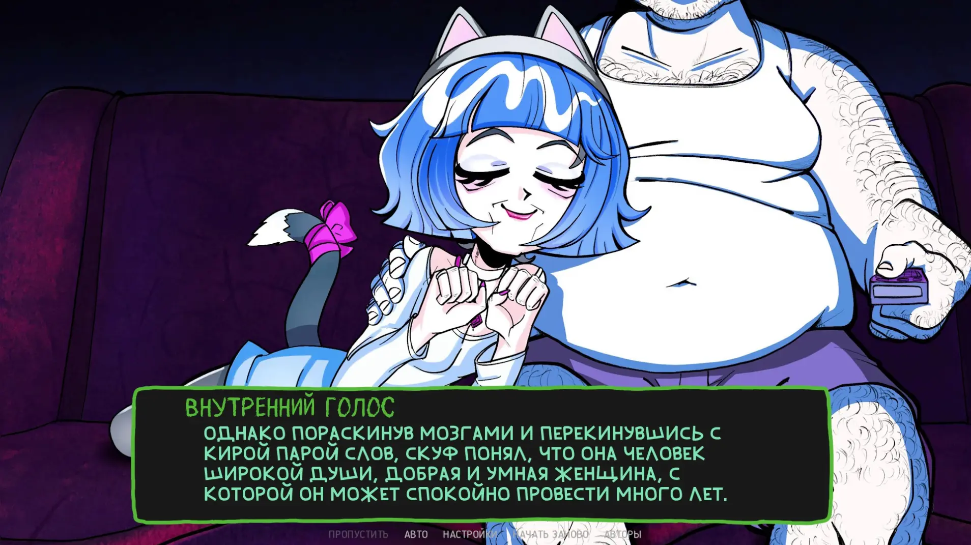 Кис-кис-кис, женщина-сюрприз. Третья альтушка — это кошкодевочка, у которой есть дети, минимум два разрушенных брака, домик на шести сотках и любовь к самодельному сидру. Вообще с ней завязывается самый душевный диалог. Скуф сознается, что недавно его родители умерли, а Кира тоже потеряла близкого человека. Но даже тут бывают проблемы с текстом.