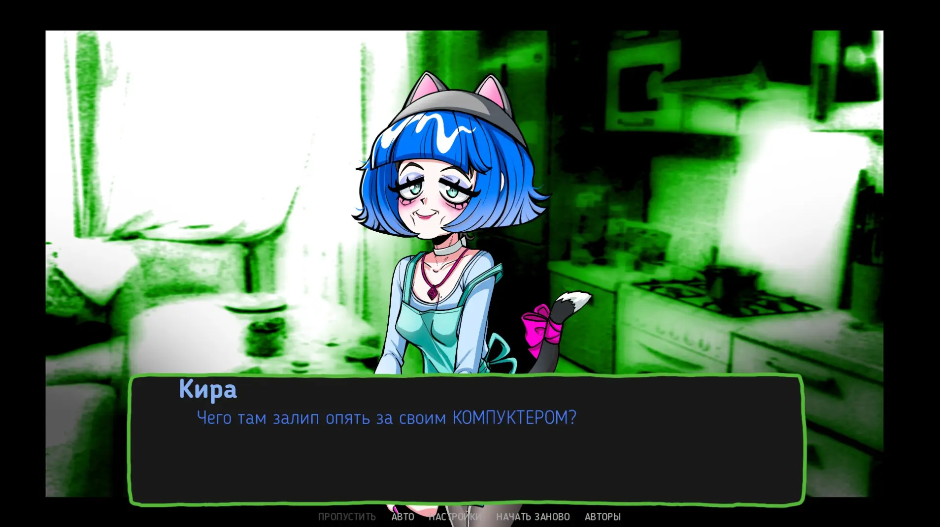 У Нюши три концовки. Альтушка завидует сестричкам с первой страницы и мечтает занять их место. Для этого ей надо, чтобы Скуф ввел капчу (сложил простейшие пазлы), — так одна из девочек пропадет, а на ее месте окажется Нюша. Звучит любопытно, но реализация просто отстой. Если вы удалите Настю, то ее место займет Нюша только визуально — голос, диалоги и реакция Скуфа никак не изменятся. Разрабы даже заглушку не поставили. То же самое и с Ксюшей. А если вы откажетесь от помощи, альтушка удалит все ачивки, которые вы накопили за каждое прохождение. Геймеры в ярости.